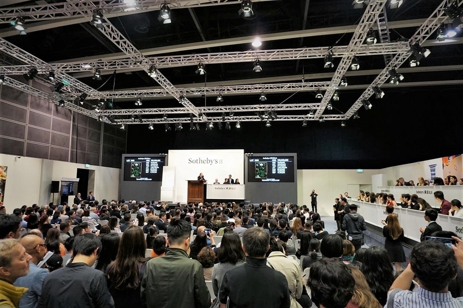 2019年香港蘇富比現代藝術晚間拍賣現場,正競標吳冠中1974年的《荷花(一)》。(© Sotheby’s)