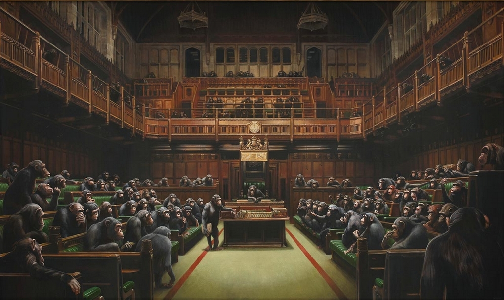 班克西《下放國會》(Devolved Parliament)與《提問時間》(Question Time)對比圖。