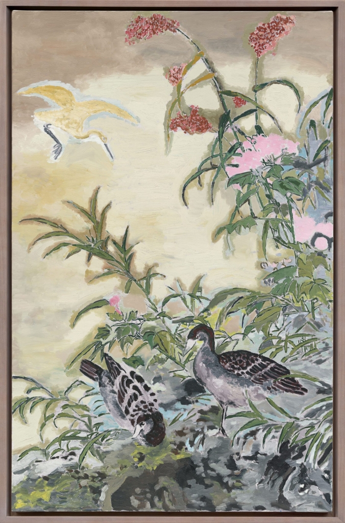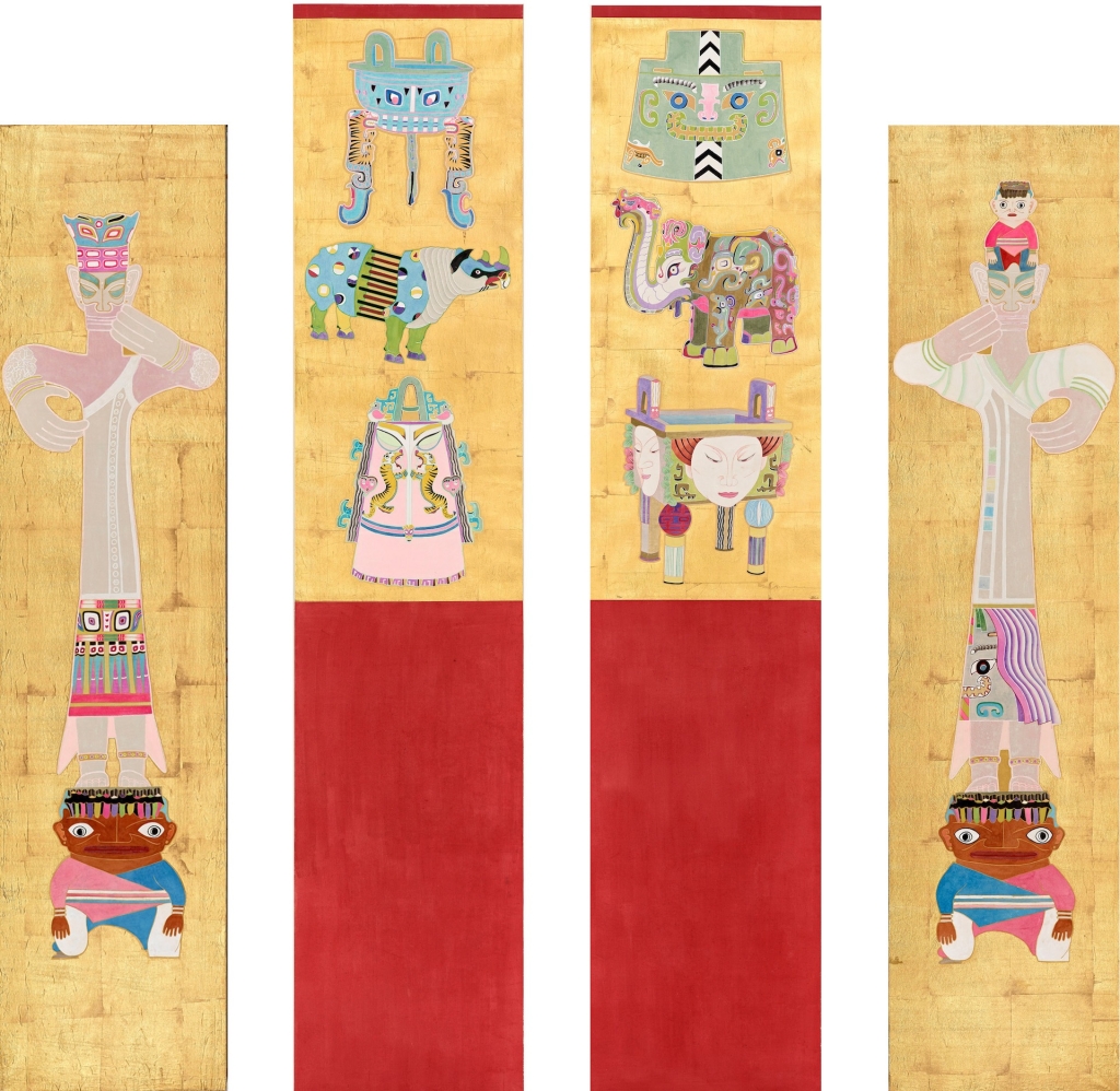 四聯屏是中國藝術特有的書畫形式,或稱四條屏,以往常見於帝王將相、達官顯貴之家,每幅能獨立欣賞亦可四幅並置,而袁旃創作於2011年的《博古四聯屏》則完全翻轉了既定認知的形式。她以三千年前的四川三星堆文物再到商周時期的青銅器為主題,採用鮮豔的當代色彩將莊嚴肅穆的文物大舉翻轉形象,並以「圖鑑」式排列畫面,使觀者可以從每件文物找到隱藏於表象下的符碼,既是說文解字,又能解碼對照自身,在萌度爆表的圖像之下看到所蘊含的文化底蘊。這得力於袁旃汲取中西方藝術教育與文物修復專業訓練,而後任職台北故宮博物院的經驗,得以浸淫千年文物的洗禮,一如她每日寫字練筆的積累,也造就即便在45歲才重拾畫筆,仍在「求異、求新、求變」的創作意念下突破傳統、博古而創新,可謂大器晚成。如同2020年袁旃於龐畢度藝術中心個展的策展人凱薩琳.大衛(Catherine David)所說,文物成為連結藝術家個人生命與文化歷史和大敘事之間的環節;袁旃透過在繪畫中的重新塑形,暗示著生命中的地理遷徙,歷經了戰亂、冷戰與文化認同的社會處境,乃至跨文化、跨形式的創作世界。袁旃的畫作多彩而豐富、細節深富寓意,體現在《博古四聯屏》呈現出與傳統文人山水畫迥然相異的世界,讓一部千年歷史躍然紙上。