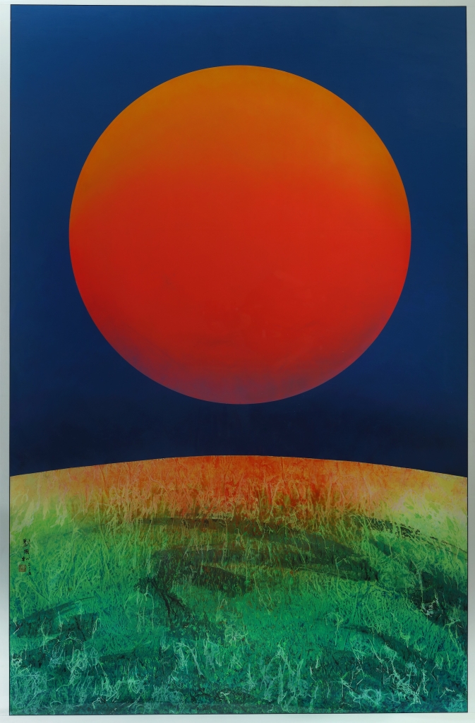 劉國松受到1969年NASA阿波羅號拍攝的太空圖像啟發,創作榮獲美國「主流69」展覽繪畫大獎的《地球何許》奠定了沿用至今的「太空系列」,將在本季上拍的《太陽圖》作品便是該題材的延續。創作於2005年的《太陽圖》以橙紅色的圓日居於構圖上方正中,前景的黃綠色地球伸展出畫面邊框,讓觀者宛若置身太空俯瞰無垠地球、遙望太陽,幾何圖形與獨創技法的結合強調宇宙的無窮魅力。與1970年創作的《紅太陽》相比,雖然使用相同構圖描繪紅日,但本作運用多種色彩,突破了前者以粉紅色為主的基調。噴繪技法渲染太陽由橙色至紅色的精妙過渡,兩種暖色鋪展於深不可測的藍色背景中,冷暖色調的對比增強了視覺刺激呈現出變幻的磅礴宇宙,也反映了藝術家對未來的嚮往。而圓形令人聯想西方抽象藝術中運用幾何圖形追求自然本質的觀念,如康丁斯基與克利都有運用圓形達到表現主義脫離外在寫實的目的。而劉國松也在1960年代就提出「放棄毛筆作畫」的觀點顛覆了山水畫定義,並首創「紙筋法」、「噴霧法」、「水拓法」等技法,並運用「抽筋剝皮皴」將特製紙張的紙筋剝除以揭露留白的線條,所描繪的浩瀚太空即詮釋了他持續地鑽研東西方藝術融會的成熟體悟。