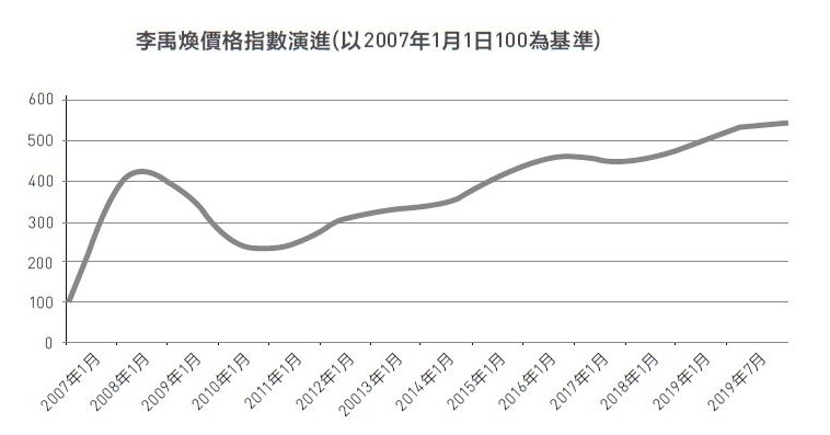 李禹煥價格指數演進。(以2007年1月1日100為基準)