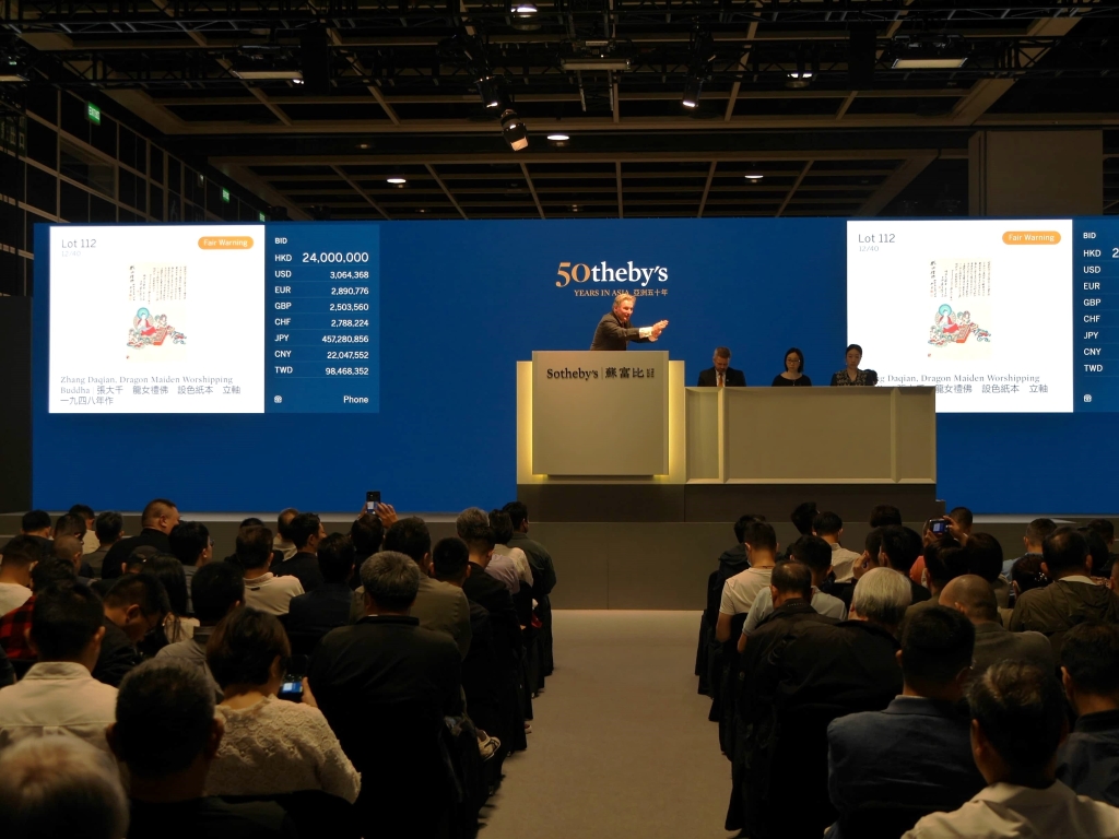 近現代書畫則由張大千1948年作《龍女禮佛》領軍,估價1000萬至2000萬港元。價位至1200萬港元後,由中國書畫部主管葉卓敏與林宛嫻手中電話委託買家兩人相互交戰,最終由林宛嫻電話委託買家競得,以2400萬港元落槌,2949萬港元成交。