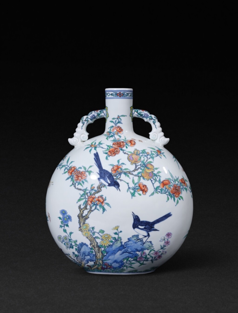 花鳥紋飾扁壺,始見於明永樂朝,清雍正時期發展出多樣青花款式,以釉上彩裝飾之雍窰作例,數量極稀,存世者多為制式紋飾,罕見如本品畫意生動、自然酣暢,宛似水墨花鳥冊頁般之紋飾風格。此件鬪彩扁壺,珍稀卓絕,無與倫比。著錄中唯一類比者為現存倫敦大英博物館的大維德爵士珍藏粉彩扁壺,然尺寸較小僅29.3公分高,卷雲紋雙耳造形與本品類似,其二面花鳥紋飾風格,其不對稱式構圖,皆似本品,惟無釉下青花勾勒輪廓線。