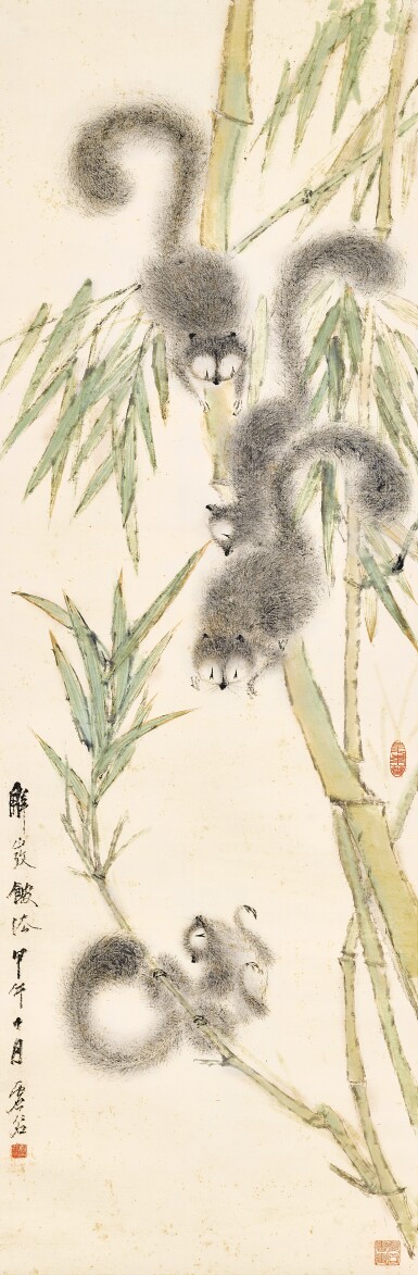 3.虛谷1894年作《翠竹松鼠》,116×37.5公分,估價70萬至140萬港元,成交價254萬港元。