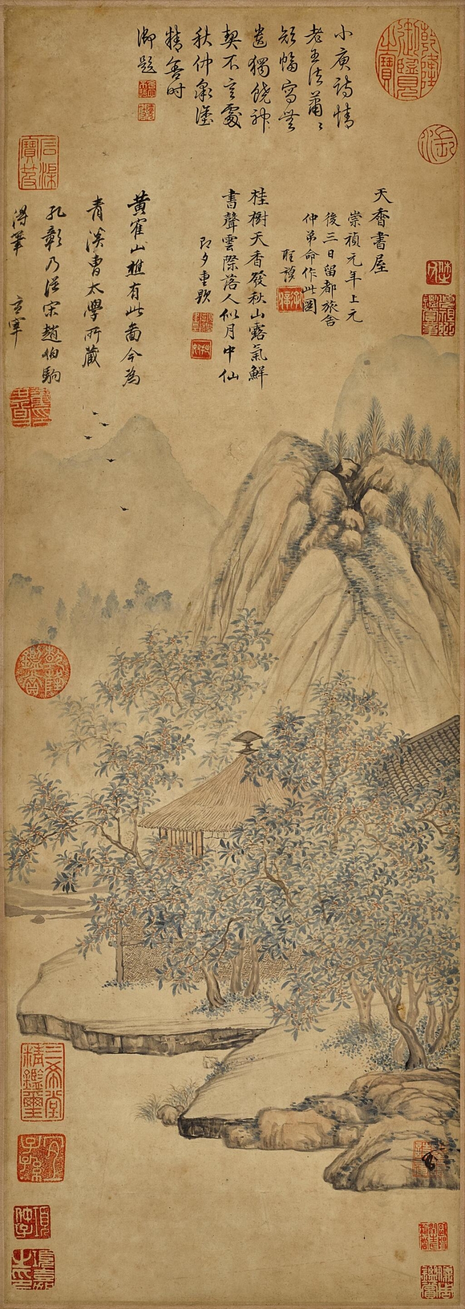 《天香書屋》作於崇禎元年(1628),上款為仲弟項嘉,或為族弟,時項聖謨31歲。當時朱由檢剛繼位,重用袁崇煥,魏忠賢自縊,朝廷一片改革之風,項聖謨作為畫家奉旨入京,可謂意氣風發,精神及藝術面貌皆處於巔峰之時。左上董其昌題跋一則、上方乾隆題詩一首,該詩作於戊辰(1748),本幅入宮當不晚於此時。梳理流傳史,項聖謨於南京繪成後,交予上款人項嘉,後得董其昌題跋,清初時入安儀周收藏並著錄於《墨緣彙觀》,後入內府收藏,得乾隆御題詩文,於1774年賜予稽璜,近代則流入日本,得內藤湖南題木盒,於1996年重現市場,後入藏樂山堂,時中國工程院院士傅熹年述:「項聖謨(1597-1658)《天香書屋》一洗本來面目,筆法淡雅秀美,爲董其昌(1555-1636)所賞愛,經大鑑賞家安麓村(1683-?)珍藏後,轉入乾隆(1711-1799,1736-1795在位)内府,堪稱傳世項聖談之逸品」。臺灣大學藝術史研究所教授陳葆真評:「此畫不論在造型、用筆和設色方面都可稱是他一生少有的得意之作,因此,也引起乾隆皇帝的特別重視,幅上的御題可以為證」。