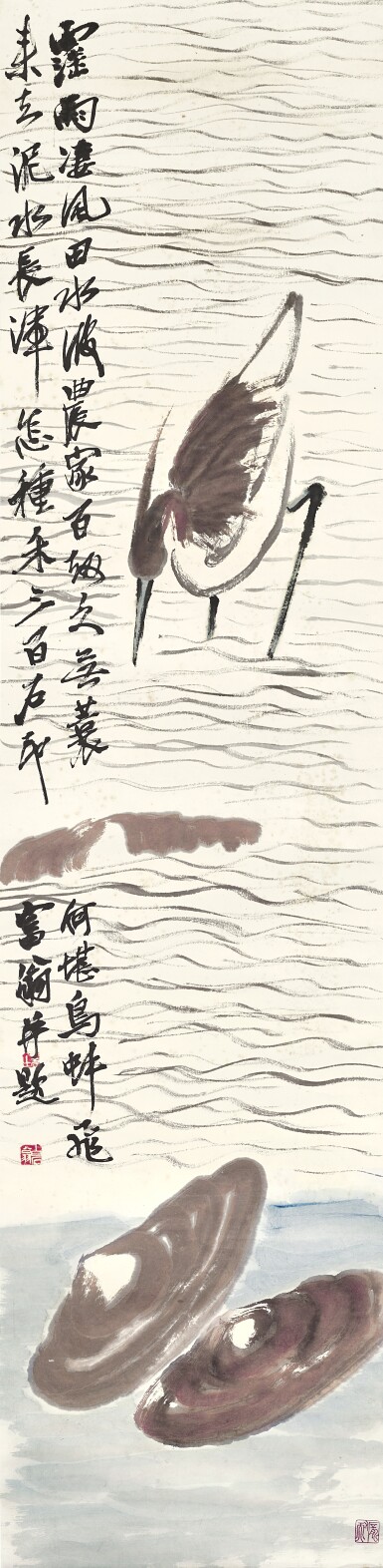 2.齊白石《鳥蚌相爭》,134.2×32.7公分,估價80萬至160萬港元,成交價381萬港元。