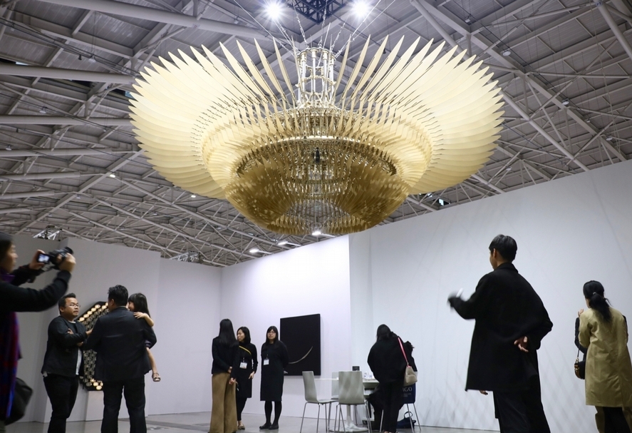 今年台北當代,誠品畫廊推出甫獲「總統文化獎」的藝術團隊——豪華朗機工。這也是豪華朗機工大量參與包括世大運、花博等國家級的大型專案後,再次現身藝博會。成員張耿華、陳志建表示,今年恰好是團隊成立十周年,他們也思索如何在十年脈絡中,找出成熟而完整的作品特質能夠在藝博會這樣的場域呈現。最後,他們選擇以「太陽」這樣能量光體的意象,展出運用鋁合金、不銹鋼等輕量材質,以13,000個零組件與馬達打造而成的動態裝置《太陽之詩》。以回收玻璃瓶安裝在不鏽鋼與鋁合金的骨架上,改造成以程式控制的《日光域》等作品。「匯聚」是豪華朗機工作品脈絡中的重要意義,不同領域技術的激盪、眾多回憶與共感塑造成觸動人心的狀態,在新媒體、技術、藝術表現與場域等面向,呈現一個跨領域藝術團體十年的積累與脈絡。