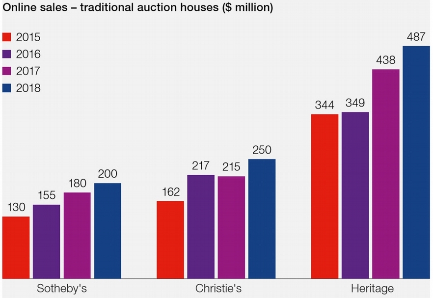 不過,依據藝術市場研究公司ArtTactic和保險公司Hiscox合作的「藝術線上交易報告」(Online Art Trade Report),一方面儘管全球藝術品線上交易的件數與金額不斷提升(圖1),2018年來到46.4億美元。另一方面各大藝術電商平臺仍然持續虧損,得利的應該是國際拍賣公司的線上拍賣,成績不俗(圖2)。