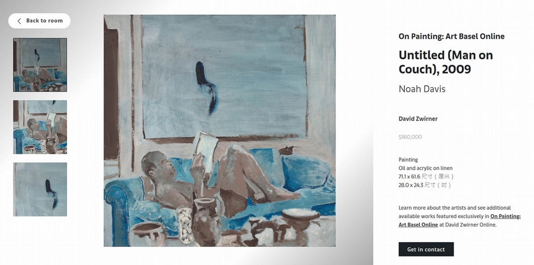 諾亞.戴維斯(Noah Davis)的作品《Untitled (Man on Couch)》(2009)售價為36萬美元。(擷取自香港巴塞爾線上展廳:卓納畫廊)