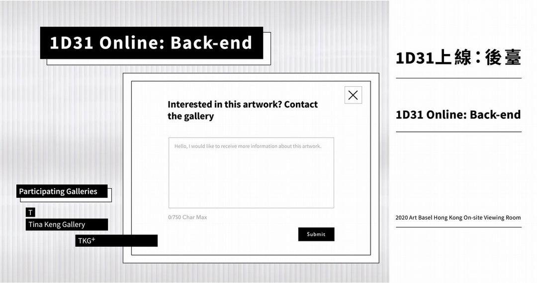 除了利用巴塞爾藝術展首屆線上展廳的平臺以外,耿畫廊聯手TKG+策劃特展「1D31上線:後臺」,將巴塞爾藝術展線上展廳解構變體,與實體展覽聯集展出,對於藝術展演與收藏平台所面臨的變革延伸進行探索,讓線上策展變得更加完整。(©耿畫廊、TKG+)