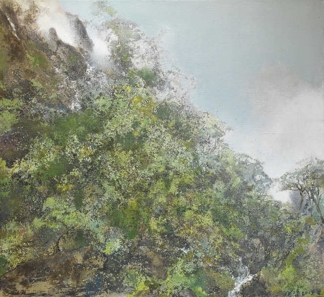 索卡藝術於香港巴塞爾線上展廳呈現六位亞洲深具影響力之藝術家的作品,包括:以西方油畫概念傳達中國山水的悠遠意境聞名的洪凌,圖為洪凌《柔雨》,油彩、畫布,110x120cm,2019。(索卡藝術提供)