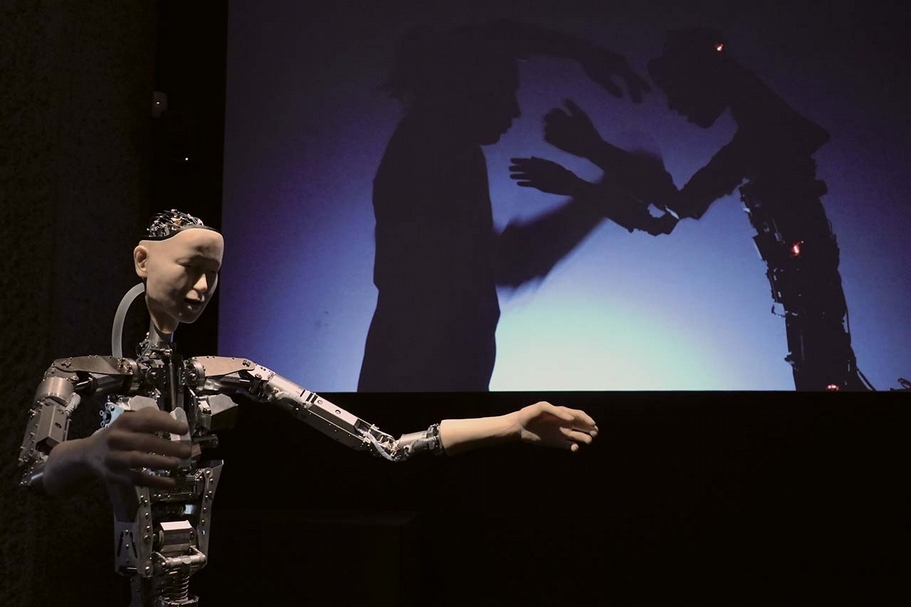 來自日本的擬人機器人Alter會學跳舞。圖為倫敦巴比肯藝術中心(Barbican Centre)「AI:超越人類」(AI: More than Human)展覽上的Alter。(攝影/朱貽安)