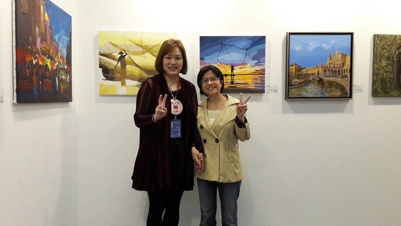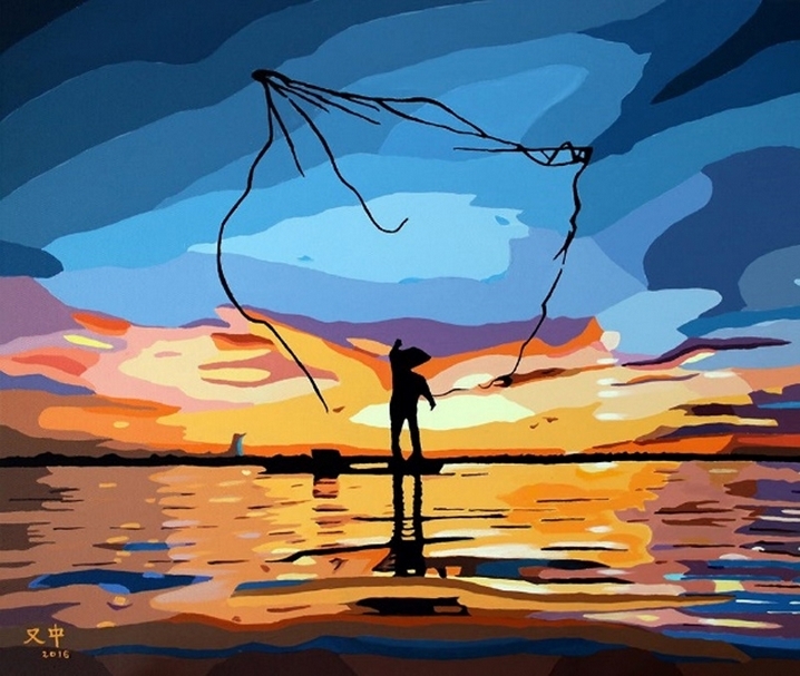 施又中作品〈漁夫〉1&2入選2017台北新藝術博覽會「國際藝術家大獎賽」。她的漁夫作品,將海的多樣與變化,用最單純、簡潔的色塊,給予最直截卻深刻而細膩的描繪。尤其以一位漁夫的身影帶出純樸、無爭、寧靜的畫面。台灣,一個環繞大海的海洋國度,施又中用她的〈漁夫〉拈出了你我都似曾相識,卻又不曾留心的景象。施老師的藝術創作理念為何?聽她娓娓道來:「我的創作以自然為本,喜愛大自然豐富萬千的色彩變化及四季幻化的不同風貌,令人遐思神往。大自然風景對我來說不僅是一個創作的主題,更是一個表達自我情感的媒介。我希望將大自然的美透過繪畫的表現方式傳遞給觀眾,並希望觀眾能從中感受到美感,能夠觸動到他的心靈並產生共鳴。因為美是從大自然來的,美感的產生有兩個條件,一個是發自內心的需求,另一個是環境中美的事物,而這兩者都來自大自然中。我喜歡運用鮮明飽和的色彩,藉由不規則形狀及不同彩度的色塊相互交錯配置,以平塗的表現方式,將客觀景物的細節予以簡化。強調色彩與形體之間的協調性,希望呈現出色彩的空間性及律動感、寫意感,並在視覺上產生新的意象和共鳴。我認為藝術品可以為人們帶來許多心靈的悸動,因此,我希望用我的作品來療癒人們的心靈。在我的作品裡,呈現的是柔美及寧靜的和諧,如果,畫筆的溫度能夠慰藉人們內心深處的孤寂,我願意彩繪種種美好,讓藝術繽紛大千世界!」
