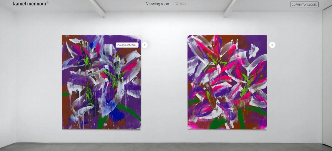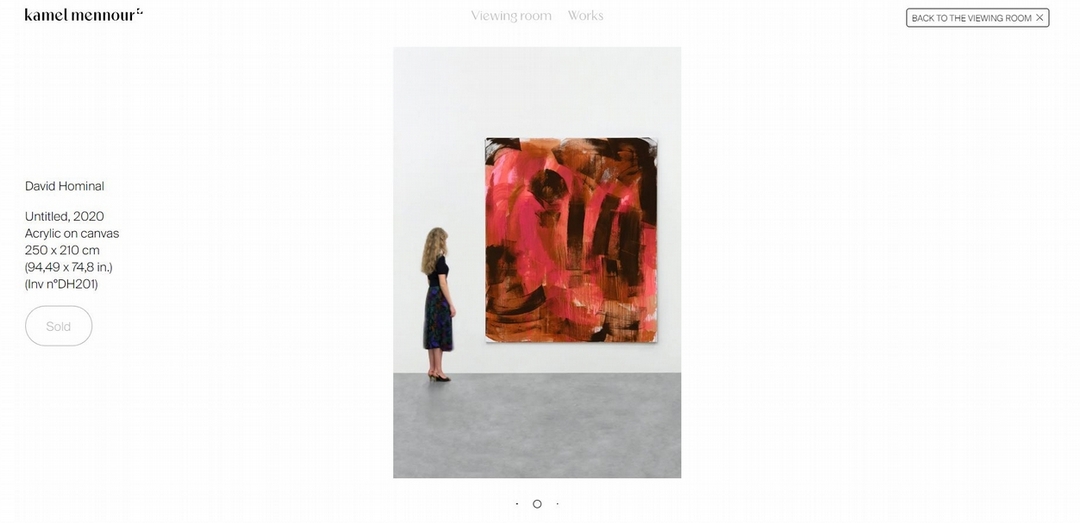 卡邁勒.梅努赫畫廊的線上展廳設計除了讓觀者有親身的感受外,更在每幅作品旁設置顯眼的藝術家按鈕,透過互動,加強觀者體驗,也更能輕鬆了解作品與藝術家。(擷取自卡邁勒.梅努赫畫廊官網)