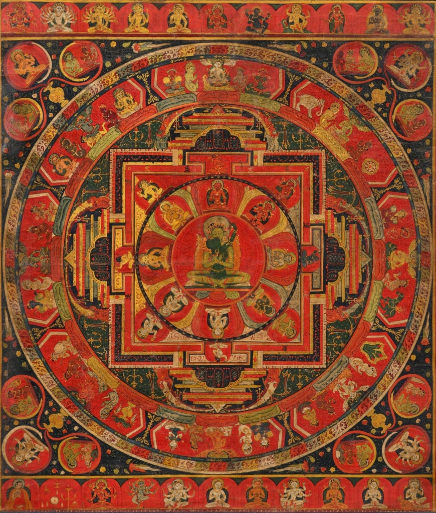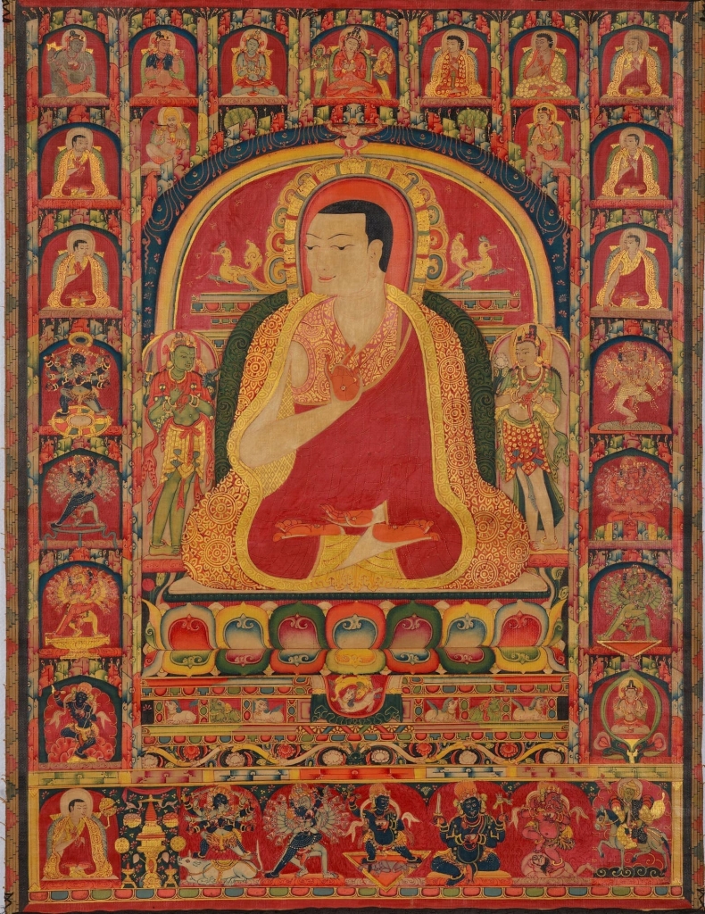 第二高價為唐卡精品代表——藏中14世紀早期《類烏齊寺第二任法台烏堅貢布肖像唐卡》,由邦瀚斯大中華區董事長胡瑞電話委託買家以700萬港元落槌,逾低估價近2倍成交,成交價889萬4000港元。類烏齊寺創立於1276年,規模龐大,又被稱為「下寺」,與主寺達隆寺「上寺」相對。該寺主殿「查傑瑪」宏偉壯麗,據載竣工於第二任法台烏堅貢布時期。兩寺唐卡一脈相承,風格強烈鮮明,構圖嚴謹,筆觸細膩,眾佛陀、祖師及眷屬神祇各具精彩細節,令人讚歎。而上師題材之唐卡,尤顯藏傳佛教對法脈與師承之尊崇,承載歷史與宗教雙重之重。此唐卡依循「上寺」達隆之繪畫樣式,主尊祖師像佔據畫面中心;左右各有協侍菩薩,仍帶有印度三折姿之神韻;下為五彩蓮花及寶石須彌座,四周環繞其傳承祖師及喜金剛、大黑天等眷屬神祇,足下或坐騎、或供台、水火光輪,皆不相同;瑞獸點綴其間,設色明豔,裝飾圖案繁複精巧,富麗堂皇。祖師之頭光、大氅等多處描金,華貴無方,數百年後依然如日光璀璨。