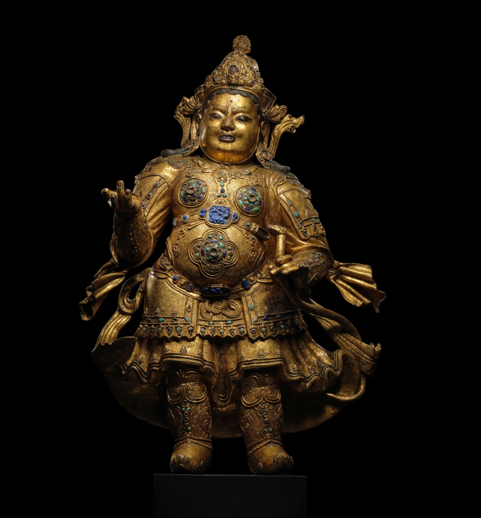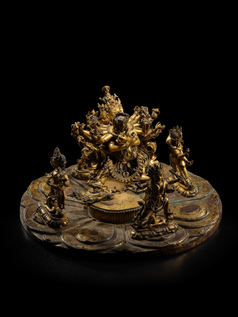 本場以藏中丹薩替15世紀早期《銅鎏金西方廣目天王像》領銜,自2000萬港元起拍,經歷5口叫價後,以3100萬港元落槌,加佣金為3796萬4000港元,奪得桂冠。此尊造像出自藏中地區丹薩替寺,曾屹立其寺內一座吉祥多門塔之上,莊嚴威武,鎮守西方,為丹薩替寺最為碩大而壯觀的作品。丹薩替寺曾經無比顯赫,其造像為佛像藝術最為輝煌、最具代表性的成就之一,較西藏其他時期鎏金銅像更為碩大厚重、寶石琳瑯奪目、細節豐富優美,是藏家夢寐以求的珍品,惜傳世極稀,品相極佳者更是寥若晨星。此尊像為目前所知之市場孤品,高73公分,較丹薩替寺其他題材之獨立造像大兩倍,為最巨型的西藏銅鎏金造像之一,喜馬拉雅藝術史上一標誌性重器。與此尊像體量相近的丹薩替天王像屈指可數,且已入藏於巴黎吉美博物館、北京首都博物館以及臺北故宮等,此尊像可謂傳世市場孤品。