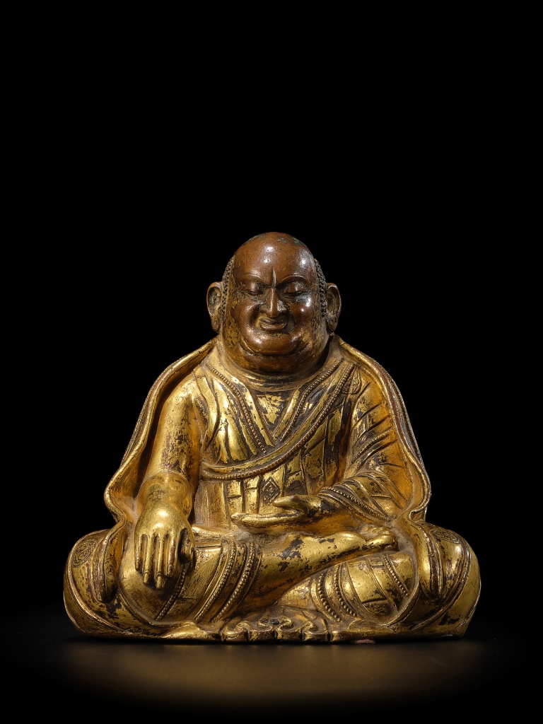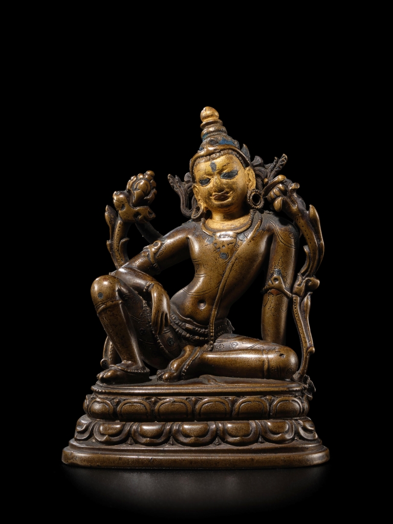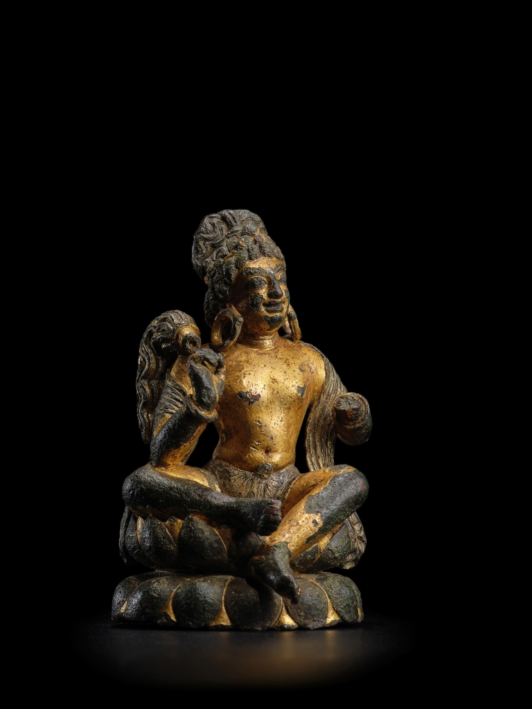 最振奮人心者當為犍陀羅4至6世纪《銅錯銀鎏金鎏銀持拂塵者像》,高8.3公分,以逾低估價3倍多之成交價610萬港元,奪得季軍,成績傲人。此尊持拂塵者像小巧精美,出自顯赫「菩薩道收藏」,並曾長期借展於紐約魯賓藝術博物館(RubinMuseum of Art)及牛津阿什莫林博物館(Ashmolean Museum),乃橫跨中亞與北印度的鎏金銅像傳統與絲綢之路的最經典的例證之一。此像體態無比生動柔和,亦可見對西方古典形體之偏愛與笈多王朝風格在此交織。其面孔微揚,神采奕奕。此造像金屬桿的位置較低,與斯瓦特銅像常見在肩骨之間位置有所不同,年輕俊美的男子所持拂塵,乃印度皇室的神聖象徵。題材方面,則常見於犍陀羅,羅馬式的髮型又為陸上與海上絲綢之路之見證。另一尊高8.4公分的小佛像,印度東北部帕拉時期約11世紀《錯銀錯紅銅文殊菩薩銅像》,成交價104萬5400港元,成績喜人。佛教藝術研究者陳百忠表示,這類精美的古代小佛像,能代表著印度早期佛教文化的光輝,並為聖僧親赴印度留學的證物。
