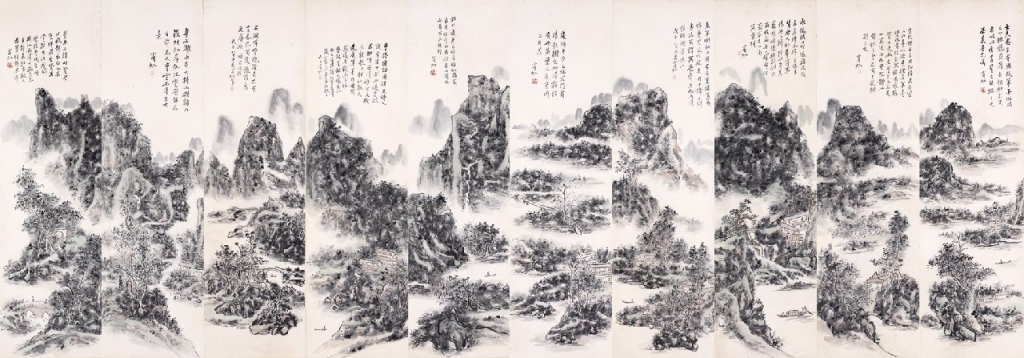 黃賓虹85歲巨作《山水十屏》。這樣的大幅作品在黃賓虹作品中,尤其是流傳民間的作品中並不多見。上款人「黃居素」,其曾不遺餘力在香港和廣東一帶的名流朋友之間推廣黃賓虹的作品,其個人之「緣山堂」即收藏有大量黃賓虹的畫作精品,為賓翁1930、40年代的主要「供養人」之一。故而,黃賓虹受黃居素之託所作畫作必皆拋心力而為,更顯此作之難能可貴。 「渾厚華滋」為黃賓虹最突出的個人特色。喜以積墨、潑墨、破墨、宿墨互用,尤能使山川層層深厚,氣勢磅礴。此畫尤能體現黃賓虹扎實的傳統功力與獨特的審美個性。十屏構圖多於畫的正上方一高山巍然聳立,中腰下黑壓壓的山巒橫斷其面,中間留出一條白帶,令高山與低巒形成了黑白、開合、虛實的強烈對比。那高山濃黑的整體中又間以溪水瀑布傾瀉而下,或以山路襯之,使高山更高。加之前景下方留大片的虛白,中著小舟,橋梁隱士住於其間,畫面呈現出空靈靜謐的無言美境。全作色墨融和,意境閒雅,傳達出作者淡泊曠遠的審美情味。「之」字型的構圖法,將沉鬱的江山以三段不同的形態分別畫出,產生了一種縱深、突兀、幽然的神韻,構圖統一卻又變化多端,實為世所罕見、十分難得的佳構。