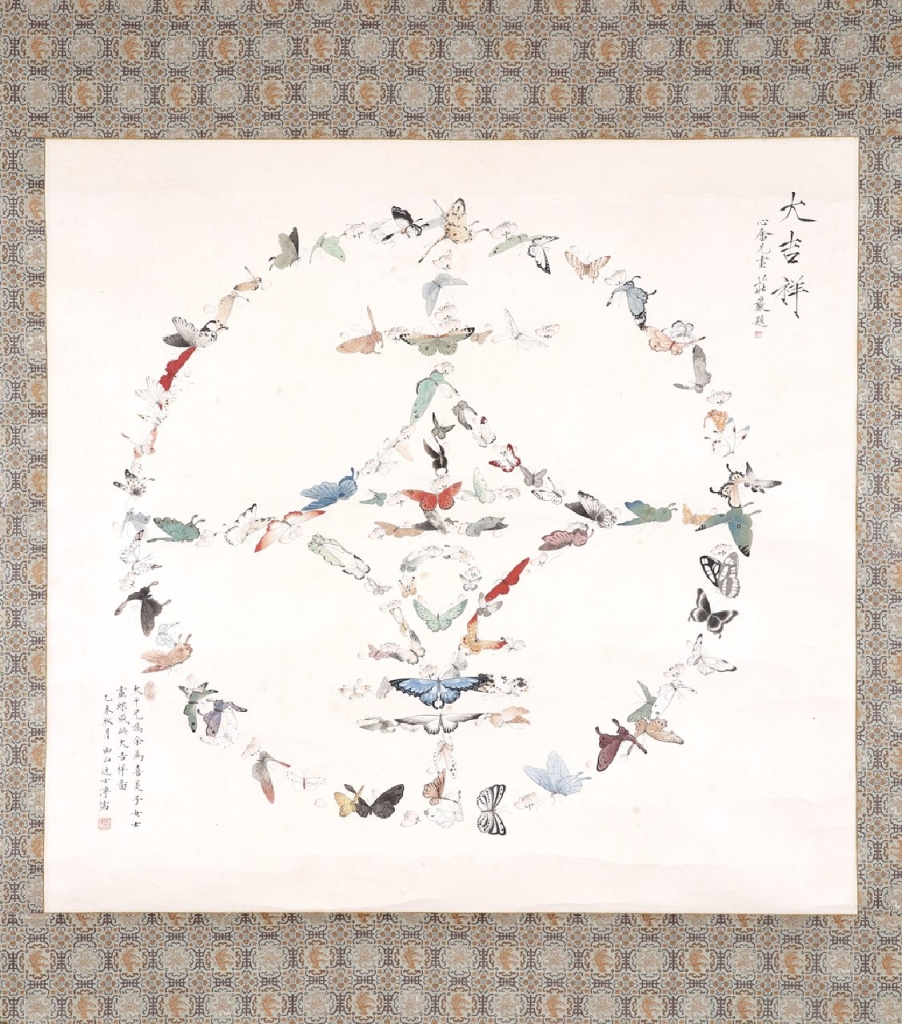 「日本回流物件非常難得,除了先前所說的清乾隆《青花八吉祥燒菊仙蓮紋四足蓋壺》。書畫作品也是相當精彩,每次所徵集到的溥心畬、弘一(李叔同)都是相當難得的精品。」溥儒《百蝶圖》,作於1955年,彼時張大千與溥心畬同在日本。此作溥心畬題識:「大千兄囑余為喜美子女士畫蝶,成此大吉祥圖。乙未秋月,西山逸士溥儒。」莊嚴題畫名:「大吉祥。心畬兄畫,莊嚴題。」畫中百蝶飛舞環繞成圓,中間舞成「大吉祥」字樣,整幅工筆精細,多彩多姿,寓意吉祥美好。上款人更是張大千的東瀛紅粉知己「山田喜美子」,她為大千最後一位情人。兩人相識後,喜美子深得大千喜愛,聘為貼身秘書,打理大千在日本起居生活等諸多事宜。