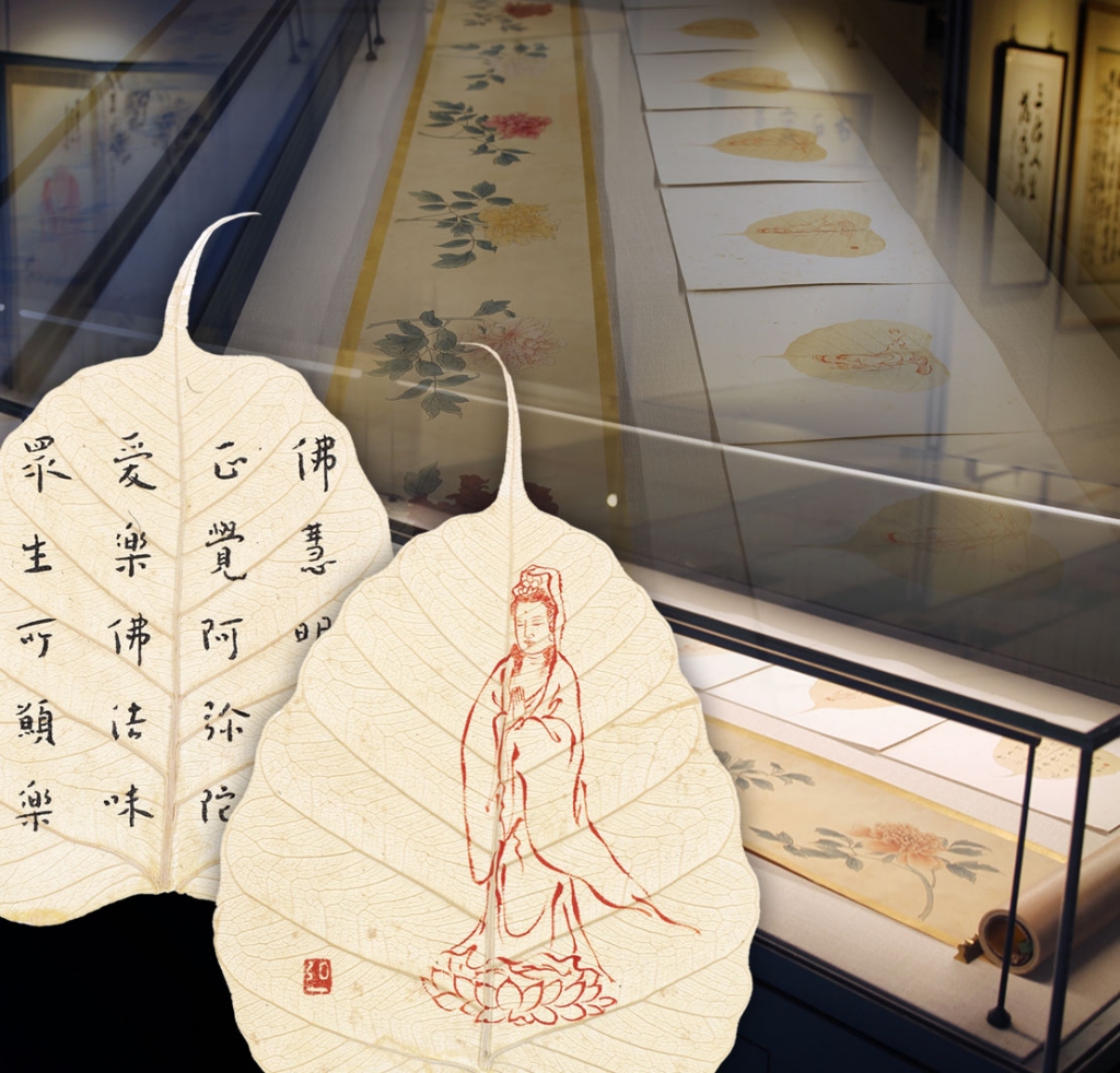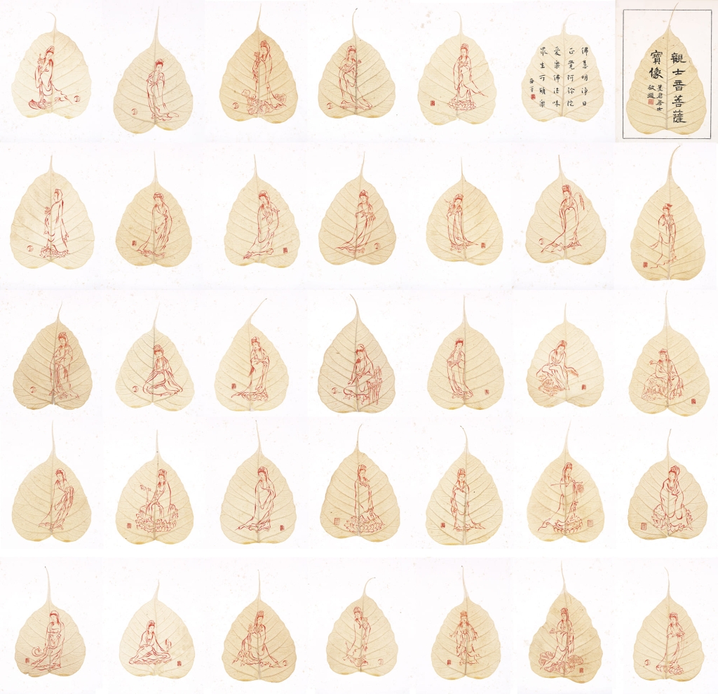 除了日本回流的珍貴精稀溥心畬精品。弘一法師李叔同的《菩提葉硃砂觀音化身》於「梵音悠遠—佛教與書畫藝術」為最受矚目的焦點。佛教藝術常以聖樹之葉繪菩提葉畫和寫菩提葉佛經,以祝吉祥以助覺悟。菩提葉上第一葉墨書「觀士音菩薩寶像。尤墨君題。墨君居士敬題。」第二葉上弘一書「佛慧明淨日,正覺阿彌陀。愛樂佛法味。眾生所願樂。無等。」其餘則以硃砂繪觀音像,33觀音像各有姿態,皆法相莊嚴。本拍品並附尤墨君(尤玄父)往來信札6通、龍舒淨土文1本。