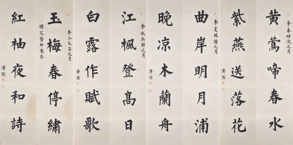 溥儒國學基底深厚,尤以對中國文字的學問趣味,開創出新意。除百蝶成就的「大吉祥」,另有日本裱鏡片書於水墨灑金箋的《柳煙秋色楷書橫批》,精工楷書的古典異體文字,有別於孰悉慣見的字形,別具一番識讀趣味。此外,晤對知交的上款人還有「國定醫師」。溥心畬晚年因為罹患鼻咽癌而於1963年過世,享年68歲。《楷書五言聯四季屏》、《鬼趣圖冊》應該是為了替他診病治療的醫師(國定)而作,雖然仁醫妙手最終未能挽回這位藝術大師的生命,溥心畬還是以他的畫筆和詩文,為世人留下了難忘的不朽成就。