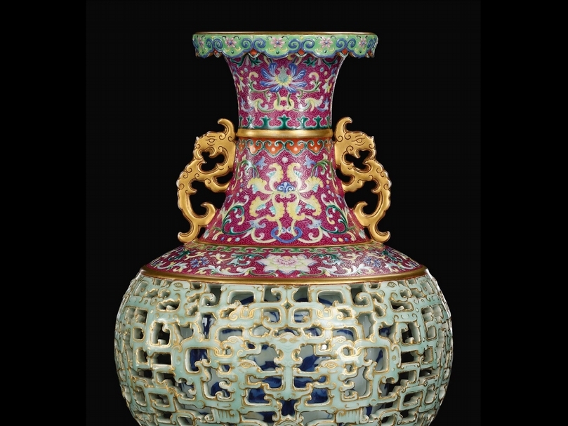清乾隆〈洋彩紅地錦上添花冬青玲瓏夾層瓶〉(編號940),瓶上盡見匠心獨運,估價7000萬港元至9000萬港元,成交價7040萬6000港元。(香港蘇富比提供)
