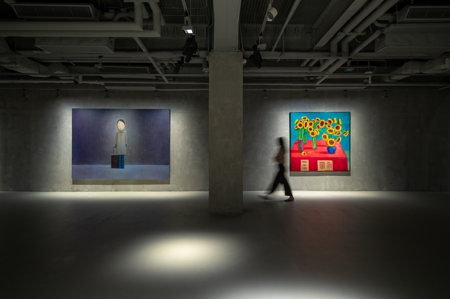 蘇富比2020春拍預展現場,左圖為劉野《讓我留在黑暗裡》,右圖為大衛.霍克尼(David Hockney)的《三十朵向日葵》。(© Sotheby’s)
