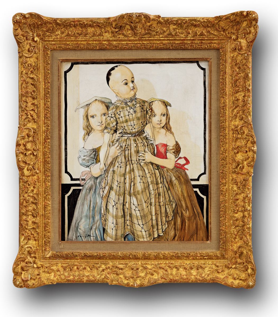 完成於1954年的《抱人偶的女孩》為被譽為「將現代日本繪畫傳統作為照耀歐洲繪畫的改革之光」的巴黎畫派代表——藤田嗣治人生第三個巔峰時期的重要代表作。在畫布之上,他以黑白大膽劃分牆面,營造空間感,當中兩位身著藍與紅衣的少女,高抬起一個巨大的人偶,藝術家刻意將人偶放大,使觀者得以聚焦其細節,他以墨黑的細線細心勾勒,從人偶的髮型、衣服上的蕾絲、脖子上戴的心形十字架紋飾的項鍊、腰帶上的珍珠,手臂針針接縫的痕跡,一切豐富得不可思議,在一絲不苟與流利的自信線條中,全然能感受藝術家在晚年物我合一。藤田嗣治五歲時喪母,從小相對寂寞的他常把洋娃娃當作傾訴內心的對象,在晚年更親手做了五個人偶,畫中之偶,便為其最鍾愛者之一。而人偶身上的十字紋飾項鍊,正流露了藝術家對於基督教虔誠的信仰,使此作別具深意。在藤田畢生油畫創作中,描繪主角抱人偶者僅有5件,此為其一,甚為稀罕。畫中雙人的構圖與女孩復古的衣著打扮,更隱藏著他對於兒時與家姊玩耍,以及1920年代初抵巴黎時所領略蒙帕納斯黃金時代的深切追憶。