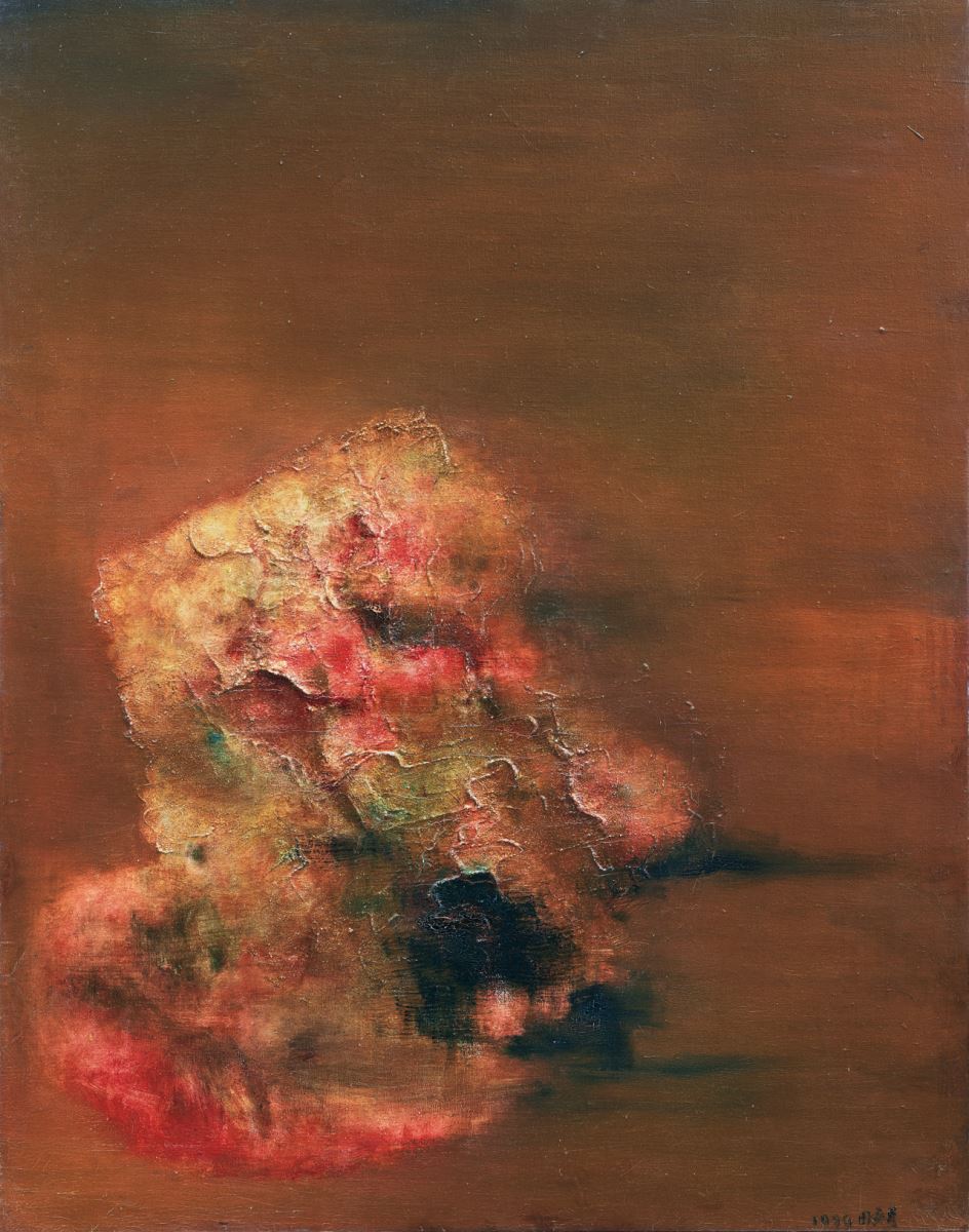 創作於1999 年《紅石》為周春芽早期「山石」系列中的關鍵代表作,該系列源自1990年代藝術家被四川雅安紅石灘上色澤溫潤、紋理豐富的石貌所打動,因而開創此系列並為之鐘情,而「紅石」更是他日後聞名中外的「桃花系列」之源。在此作中,石塊中央以玫紅、草綠、深褐色鋪就的厚實紋理形塑自然的體積感,並捉住眾人的目光焦點;躍動的色彩彼此緊密融合,形成一種浮翠流丹、紅飛翠舞的韻律感,賦予桃紅柳綠般的春日氣息,石塊左上方的一抹亮色為冰冷的石頭注入了生命,浮雕般的筆觸更進一步營造出如生物肌理般的效果。藝術家將西方表現主義引入東方的書寫傳統,從而揭示出潛藏在石頭自然屬性中的精神力量。
