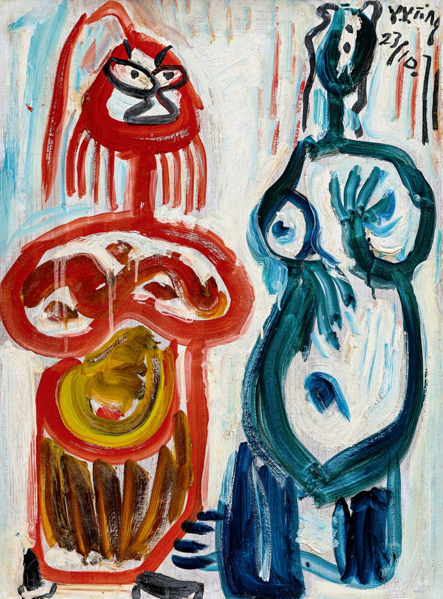 丁衍庸在《楚霸王》中,大膽給予中國文學及戲曲經典撼人的現代詮釋,他以疾馳之筆勾勒項羽粗獷雄渾的身姿,簡拙的造型突顯出原始岩畫般的動人生命力,遊弋東西的線條魅力訴說書畫同源的精神。丁公雖以野獸派色彩的「表意性」入畫,但未採如馬蒂斯(Henri Matisse)平面裝飾的造型,而將色彩的表現力糅合於東方古老的線性傳統,從而與人物的性情、氣質緊密貼合。火焰般炙熱的橙紅,展現了項羽豪放而剛烈的人格魅力,而藍彩展現虞姬的理性和內斂。飽和的用色伴隨藝術家標誌性的「頂天立地」式人物構圖而恣意流淌,豪氣萬千的情緒穿透力生成此紀念碑式的英雄氣概,形塑項羽傲視群雄的氣蓋山河。丁公一生以戲曲題材所呈現的油畫創作僅見七幅,在本就存世不足200件的油畫作品中更見稀罕,突顯《楚霸王》可遇不可求的分外之珍。