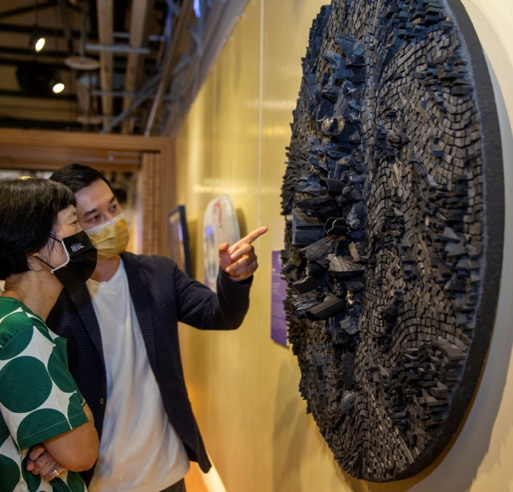 新加坡藝術家劉金桔,作品富含深刻文人哲思,融合中西技法表現水墨意境。此次以青銅器編鐘為創作發想,運用古物禮樂文化的載體,進行對話與解構並轉化為現代新的可能性。
