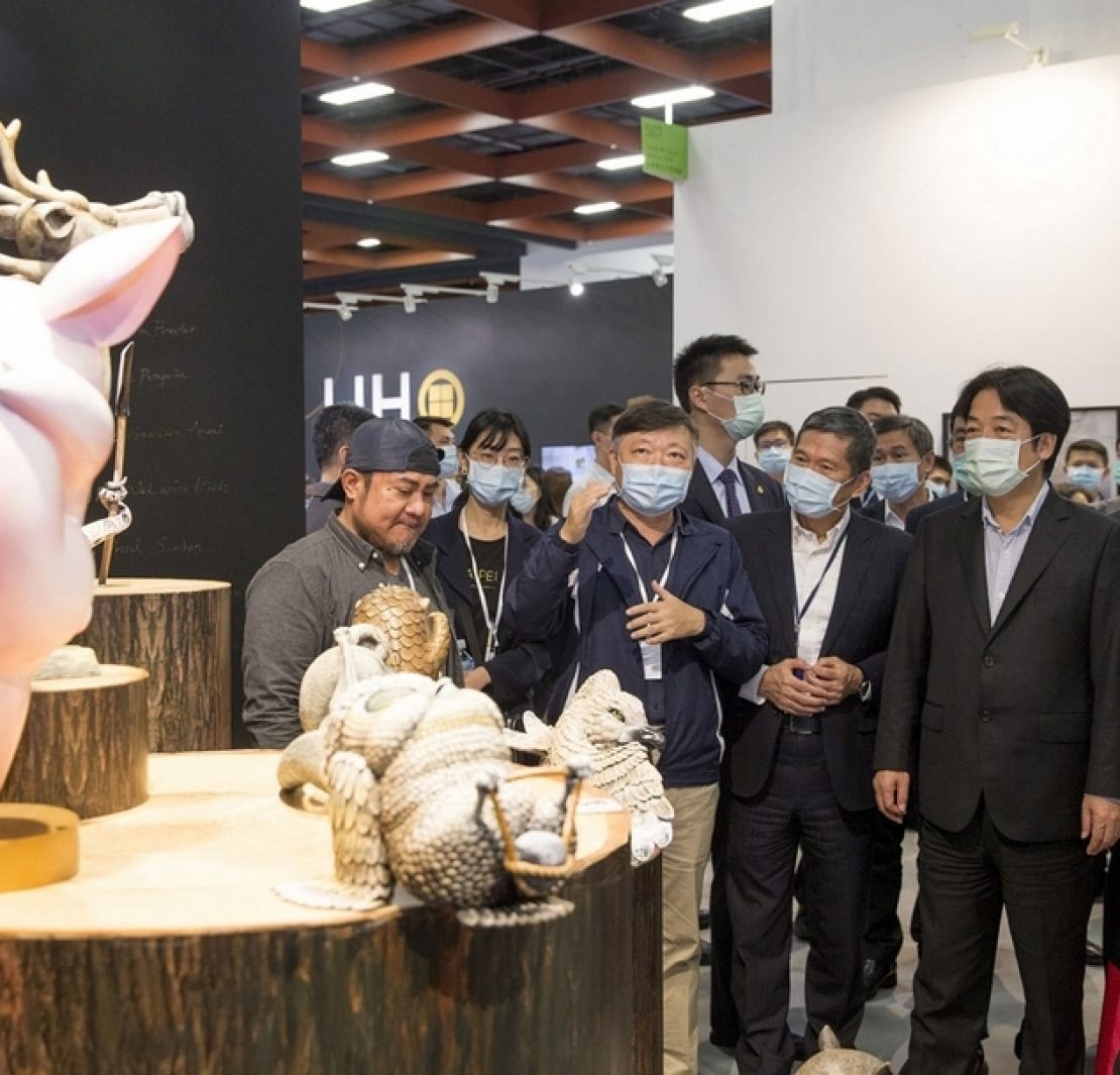 副總統賴清德、文化部長李永得、畫廊協會理事長鍾經新參觀「原住民新銳推薦特區」藝術家杜寒菘的展位。(ART TAIPEI提供)