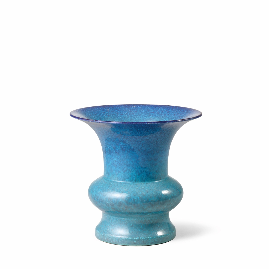 爐鈞釉為雍正時期景德鎮御窯廠新研發的仿鈞低溫釉,於唐英督陶下燒造,仿宋代鈞窯窯變釉色而來,清雍正《爐鈞釉仿古尊》此尊器型端莊典雅,為仿效宋代渣斗式尊而成,又保留了上古青銅觚敞沿寬闊之元素,線條簡潔流暢;釉色藍中帶綠,和諧融合,呈現如孔雀羽毛般之瑰麗色彩。