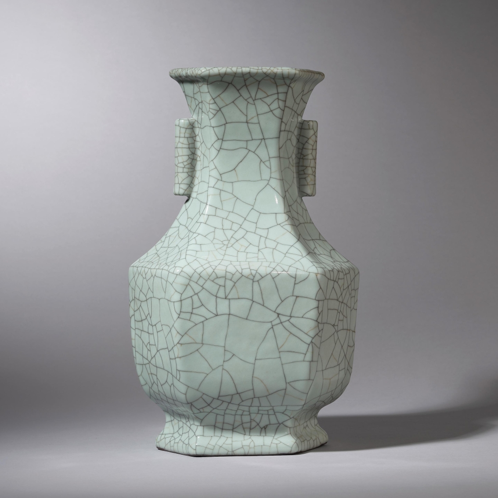 拍品焦點有:清乾隆《仿官釉六棱貫耳瓶》通體施灰青釉,釉質肥潤,釉面光亮並有冰裂紋、大開片,整體造型古樸典雅,無論從形式或風格上,本品都甚為罕見。17世紀《黃花梨軸門圓角櫃》此櫃上斂下舒,比例勻稱,用料色澤光潤,通體光素,線條流暢,整體典雅大氣。圓角櫃以小型和中型為主,如本品般尺寸碩大的則較為少見。