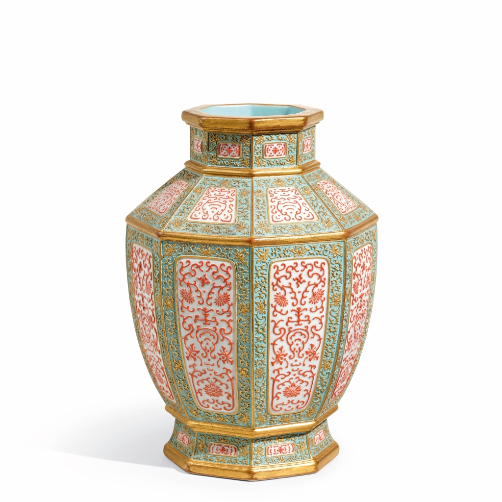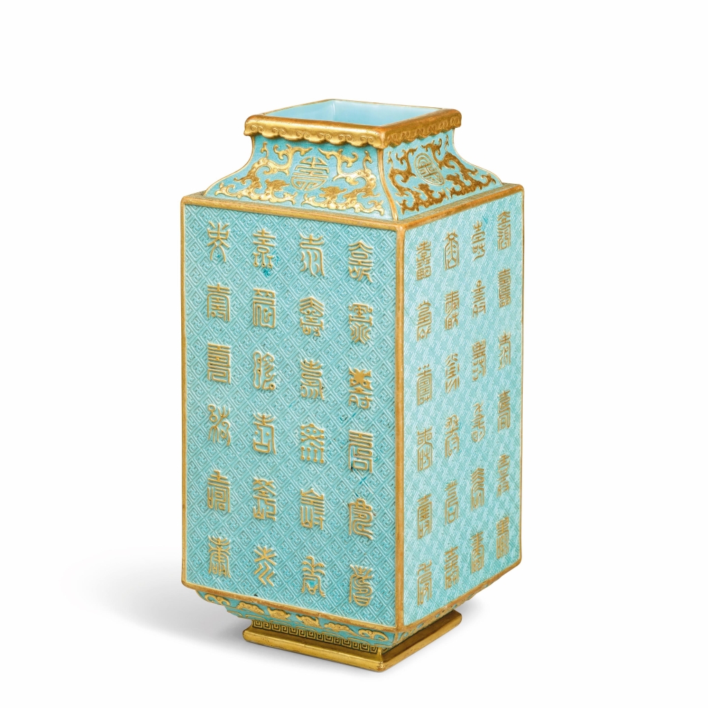 清乾隆《松石綠錦地浮雕金彩百壽琮式瓶》,器形仿自玉琮,方形長柱式而有底。通體施松石釉為地,頸部飾有仿古龍紋,其中有團壽紋,方足之上有另一組仿古龍紋,並有「C」型卷花、雷紋各一圈。通體以金彩描邊,釉彩厚重。底部帶金彩「大清乾隆年製」陽文篆書款。