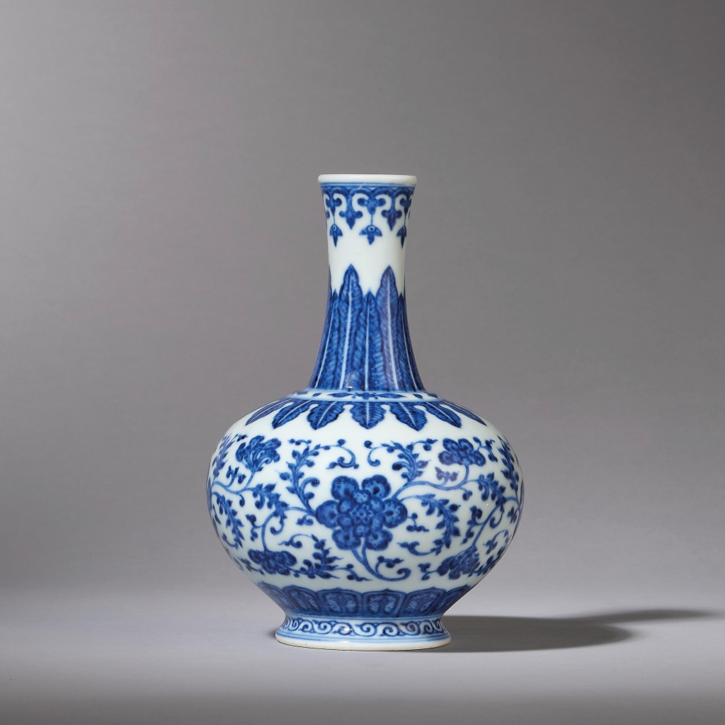 1.清乾隆《青花纏枝蓮紋賞瓶》,高17.8公分,估價280萬至380萬港元,成交價406萬8000港元。