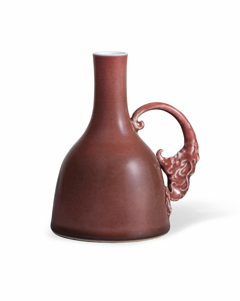 清雍正《釉裡紅搖鈴式夔龍抦把壺》,搖鈴形制乃參考康熙朝,夔龍抦把則仿效明朝且做工精良、造型特出,目前未見相同之例,最終落槌由邦瀚斯亞洲區董事總經理胡偉爔(Julia Hu)電話委託買家300萬港元競得,逾低估價兩倍多381萬4000港元成交,列席第二高價。