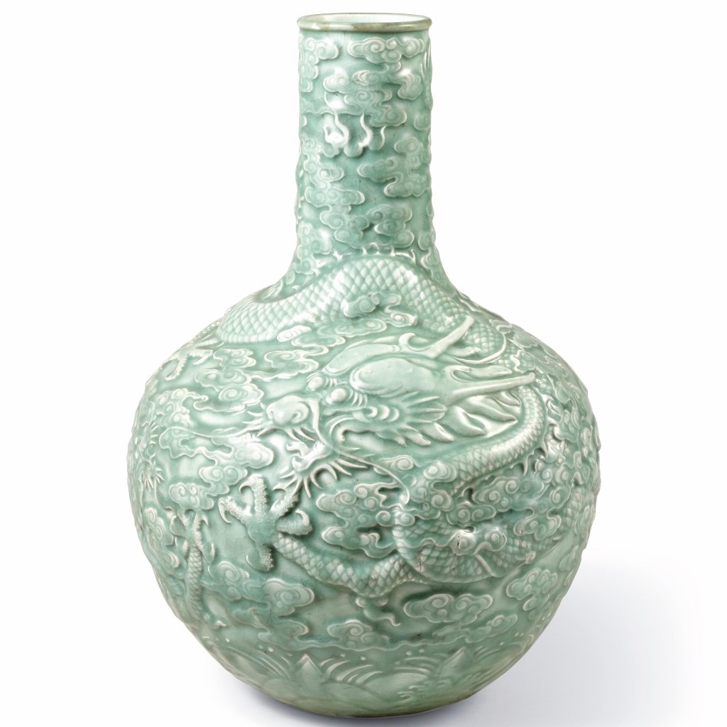 8.清乾隆《青釉浮雕「蒼龍教子」天球瓶》,高47.9公分,估價30萬至50萬港元,成交價165萬5000港元。