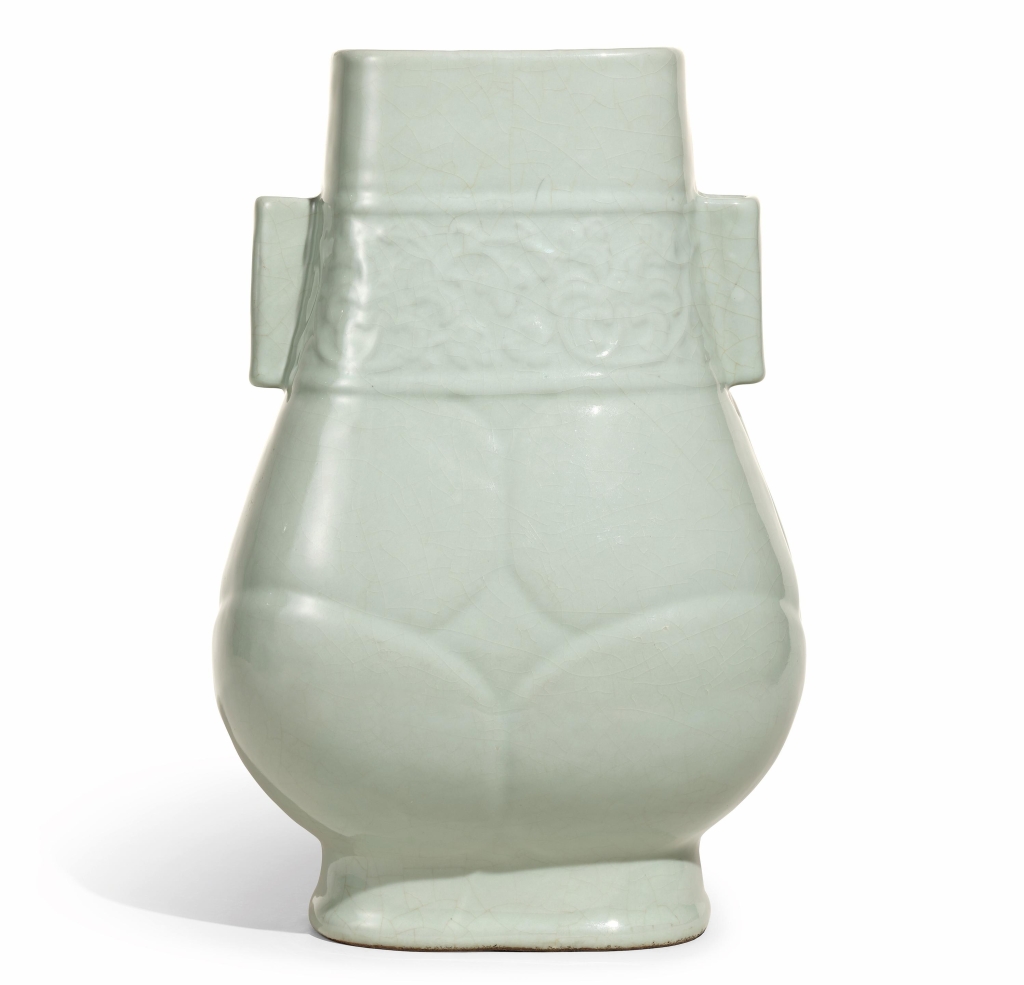 雍正帝喜愛宋瓷,仿宋代名瓷中以仿官釉為上乘,清雍正《仿官釉貫耳壺》、清雍正《仿官釉石榴尊》均可為證。前者造型仿自上古青銅器,尺寸碩大、敦實挺拔,極難燒製,釉面光潤,色澤柔和宜人。後者仿自明代石榴尊,釉色青綠淡雅,開片分明,既柔和且不失秀雅,各以成交價305萬2000港元、178萬2000港元得第四、第六高價。