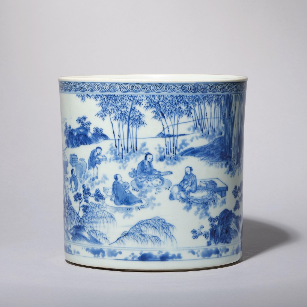 除百萬善價,另有數件瓷器斬獲佳績。清康熙《青花「竹林七賢」筆筒》逾低估價10倍多之成交價70萬2500港元、清康熙《五彩仕女圖杯》青花「大明成化年製」楷書仿款逾低估價10倍多之成交價40萬9600港元、清康熙《釉裡三彩山水圖香爐》逾低估價7倍多之成交價38萬4000港元、明崇禎《青花「明皇遊月宮圖」筆筒》逾低估價5倍多之成交價32萬港元等。