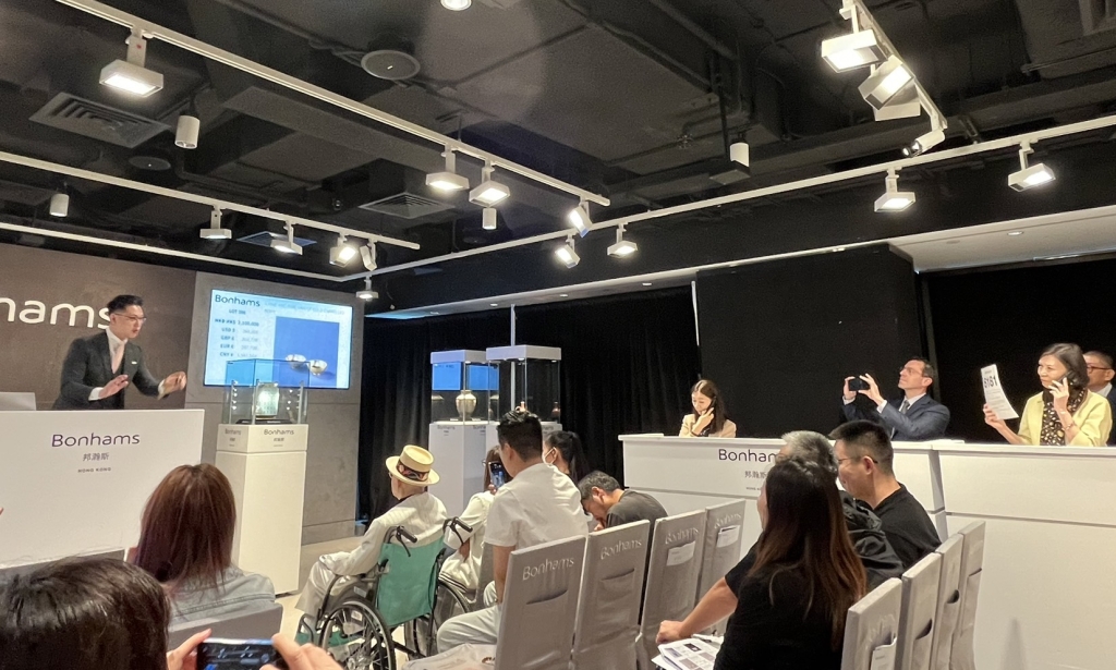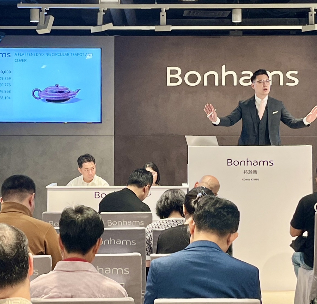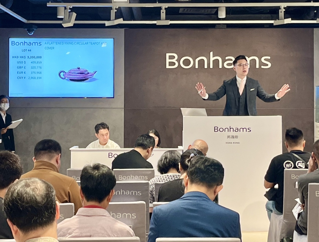 現場拍品類項多元,本場推出紫砂壺八件,僅一件粉彩未能成交,競拍場面熱烈。尤以《宜興紫砂鼓腹扁圓形茶壺》,「大彬」楷書款,以強勁的黑馬之姿,衝出本場第一高價。甫一開拍,網路競投、現場、電話委託席上舉牌應聲,此起彼落,競價飛速,買家們熱情參與,價位旋即至百萬門檻,未見停歇,最終以320萬港元落槌,由現場買家競得,加佣金為成交價406萬8000港元,逾低估價135倍多,溢價驚人,獨占鰲頭。