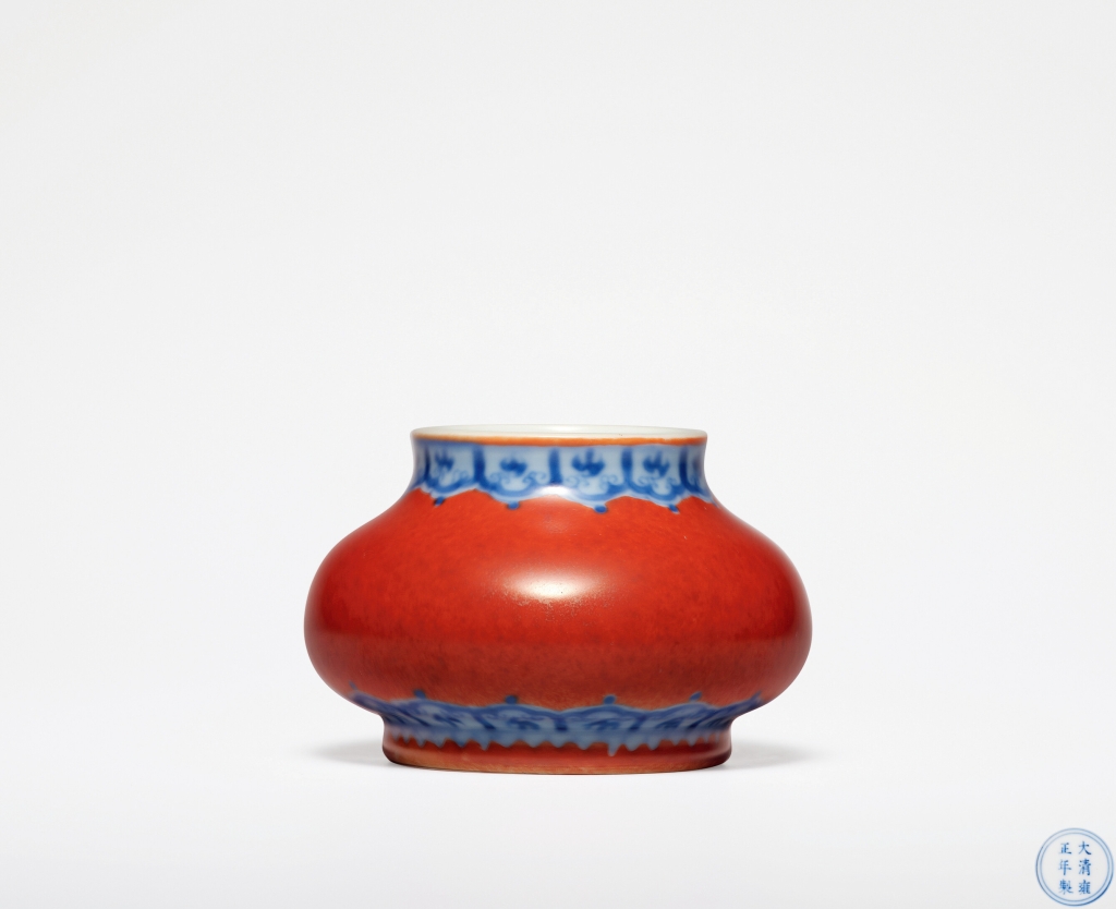 甫一開場清雍正《青花珊瑚紅蓮瓣紋水盂》即引起熱烈反應,自90萬港元起拍,網路競投、電話委託席、現場買家各方人馬競舉,在快速的穩健競價節奏下,以345萬港元落槌,加佣金逾低估價四倍多之414萬港元成交,為本場溢價最多倍之拍品。本品頸部及近足處以青花各繪一周變形蓮瓣紋,上下呼應。腹部滿施礬紅彩,與上下青花紋飾相接,顏色對比強烈,深具藝術感染力,底款青花「大清雍正年製」六字二行楷書雙圈款。本器典雅精巧,整體猶如一朵含苞待放的蓮花,俊逸不凡,為雍正時期御用文房之精品佳作,可愛喜人。此類雍正朝水丞存世數量罕少,檢閱目前公私收藏,與拍品品種相同者僅有兩例,本品曾經Max Loehr教授、藍捷理(J.J. Lally)遞藏。