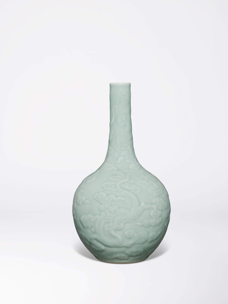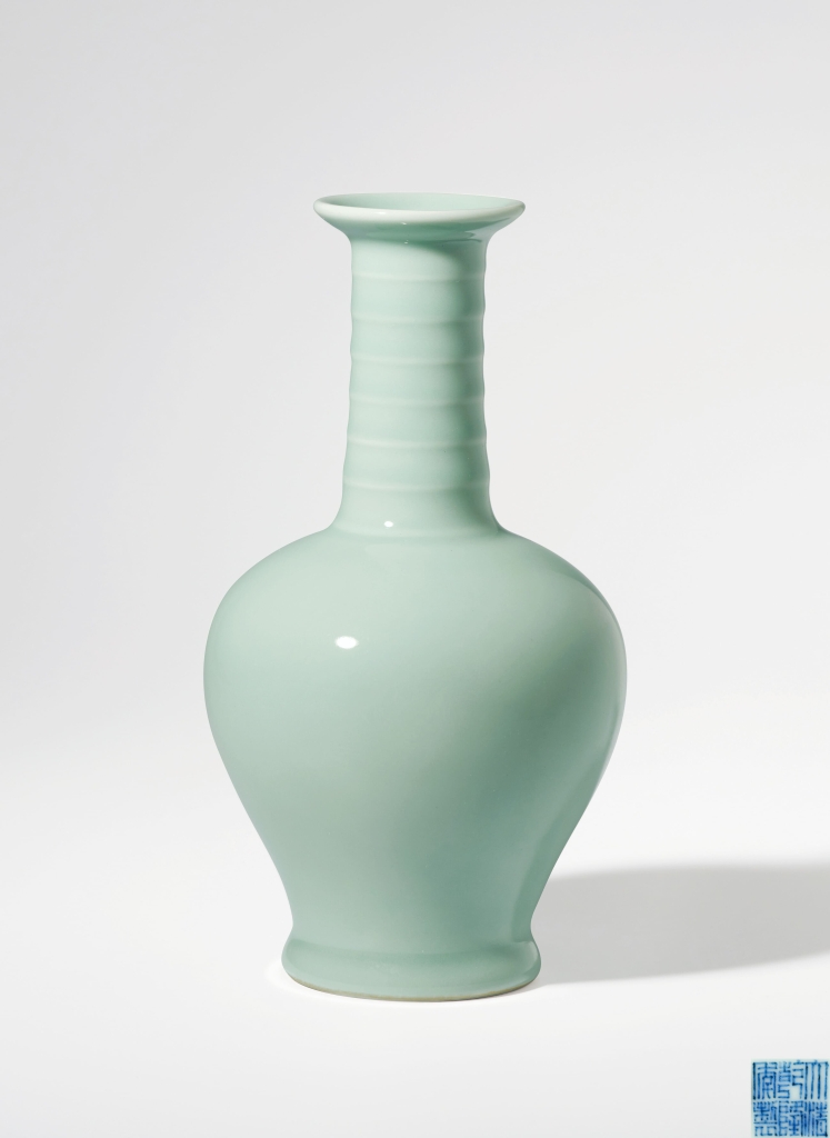 本場單色釉瓷器之清乾隆《粉青釉弦紋盤口瓶》自150萬港元起拍,多人競奪,以445萬港元落槌,成交價534萬港元,占得本場第三高價席位。本品盤口,長直頸,溜肩收腹,下承外撇足,秀美端莊,頸部起間隔相同的弦紋七棱,故又稱「七弦瓶」,頗見別致。通體施以粉青釉,厚腴瑩潤,具凝厚深沉的玉質美,而頸部的七道棱線讓素雅的釉色增添起伏,突出造型的節奏感。此類型為清代御窯仿宋瓷形制品類,屬宮廷重要陳設雅器,查閱公私收藏,存世量極少,市場幾乎不見,僅此一例,極為珍罕。