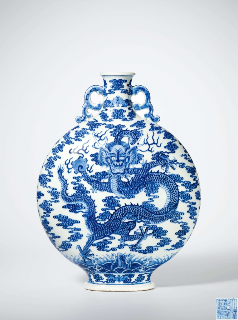 今年為龍年,本場推出三件龍紋瓷器,亦受追捧。清乾隆《青花雲龍紋雙耳扁瓶》青花「大清乾隆年製」六字三行篆書款,起拍價320萬港元,落槌價540萬港元,成交價646萬8000港元,由現場買家競得,為本場第二高價。此瓶撇口短頸,頸肩置對稱螭龍耳,扁弧腹及底內收,下承外撇圈足,整體造型敦碩大氣。前後腹壁正中以青花繪一正面五爪立龍,其中一龍爪握珠,淩空矯健身軀於雲海中。脛部裝飾海水江崖,水波生動。頸部及圈足外壁繪祥蝠紋,寓意「洪福齊天」。此瓶燒造難度大,因其腹部寬廣,且撇足小巧,足與腹交接處尤窄,故窯燒時難以安放。再加上器身扁平,使其固有的不穩定性有增無減,而體積越大,諸多燒造難題亦相應遞增,燒造完美如本品者,寥若晨星。臺北故宮博物院藏有一對乾隆青花雲龍紋扁壺,尺寸、造型、紋樣極為相似,惟寶珠在龍身中央。