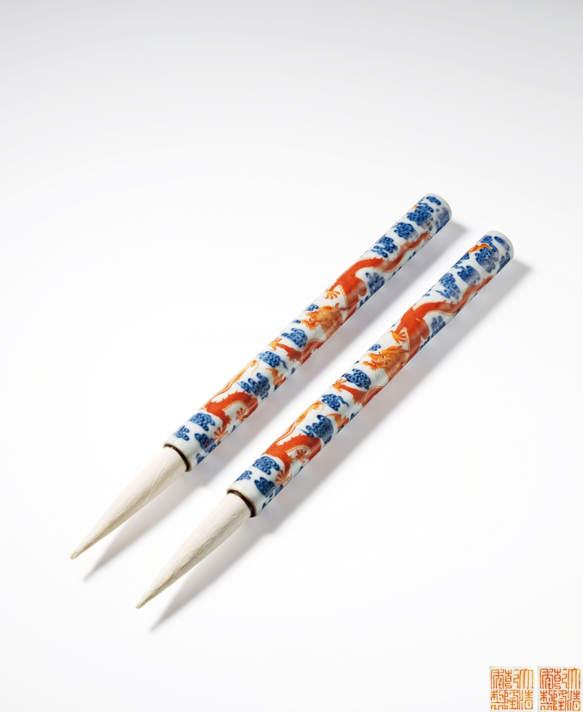 清乾隆《青花紅彩雲龍紋筆一對》受多人喜愛競奪,至戰況白熱化,仍有三隻電話委託爭舉,最終由王晶手中「880」號牌電話買家以390萬港元落槌,成交價468萬港元競得,逾低估價三倍多,為本場第四高價。筆身通體以青花繪雲紋,間飾礬紅彩龍紋及蝠紋,五爪飛龍矯健威猛,頗具氣勢,蝙蝠寓意福氣美好,富麗華美。筆管末端以礬紅書「大清乾隆年製」六字三行篆書款,為標準乾隆御窯款識書體,於方寸間書款頗為不易,而筆管所納鋒毫豐滿圓健,成對保存,難能可貴。另一件龍紋瓷器為精工小巧的清乾隆《青花龍紋小罐》,成交價132萬港元,獲得百萬善價。