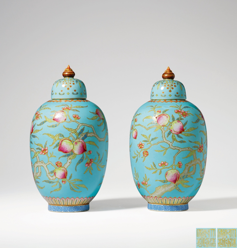 最高價為本場唯一的估價千萬精品——清乾隆《松石綠地粉彩桃紋蓋罐一對》。起拍價1500萬港元,1600萬、1700萬,價位來到2000萬,最終在歷時五分鐘後,由王晶手中「880」號牌電話買家以2200萬港元落槌,加佣金成交價2583萬港元,成為本場唯一千萬拍品,穩妥摘冠,現場一片掌聲,領銜本季中國嘉德(香港)所有藝術拍品成績。此對蓋罐有別於常見的燈籠瓶造型,線條更為圓潤飽滿,敦實可愛,比例優美,成型極其規整,極為少見。通體以松石綠釉為地,腹部以粉彩繪桃樹,枝幹盤根錯節,蜿蜒於器身,枝葉隨風飄動,嫣紅熟透的碩桃墜滿枝頭,間飾桃花朵朵,嬌嫩醉人。頸下描繪一周紅蝠飛舞,俯身望向蟠桃。脛部飾變形蓮瓣紋,圈足外以藍料彩繪回紋。瓶蓋裝飾伊斯蘭風格變形花果紋,蓋端為一荸薺形鈕。全器紋飾以描金勾邊,妙仿景泰藍上之鎏金銅絲,匠心獨運,配以勻淨厚潤的松石綠釉,愈顯金彩璀璨輝煌。罐底以金彩書「大清乾隆年製」六字三行篆書款。本品造型與紋樣和諧相宜,傳世品極少,與拍品相同者未見收錄於海內外公司著錄之中,極為珍罕。曾為暫得樓主胡惠春(1911-1995)舊藏,出版著錄於Helen D. Ling 及仇焱之,《暫得樓珍藏歷代名瓷影譜》,第四冊,香港,1950 年,圖錄編號176。