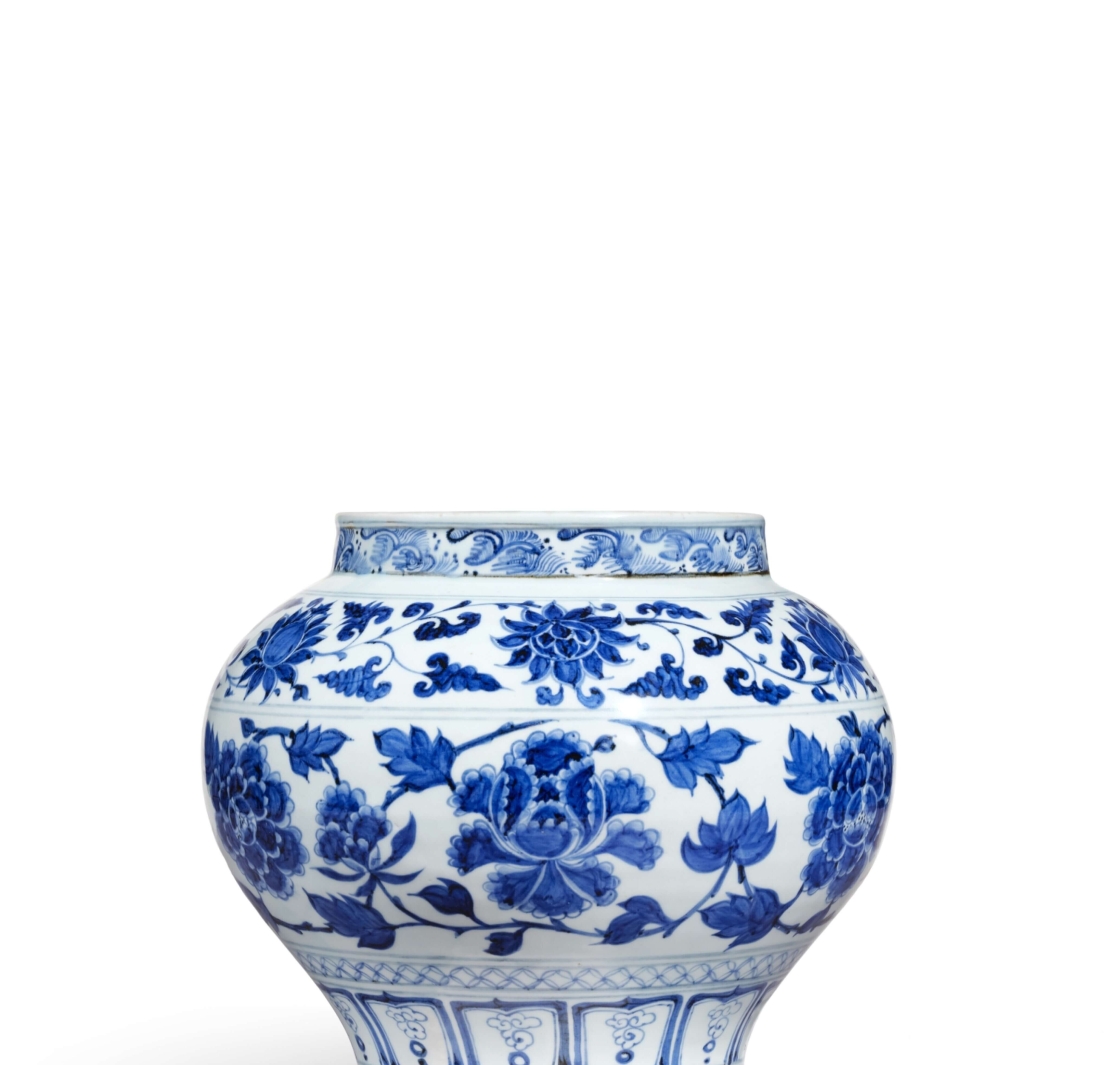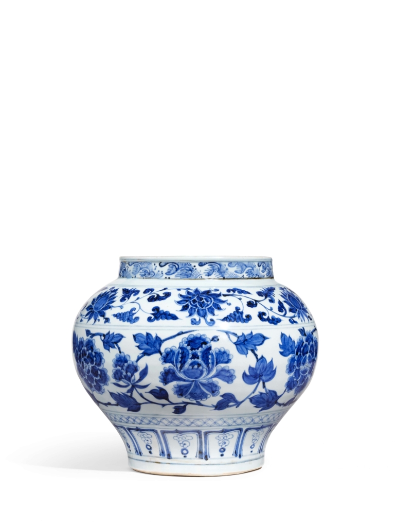 高估價拍品元《青花纏枝紋牡丹紋罐》品相良好,瓷罐造形圓潤豐美,青花細緻亮麗,濃淡層次豐富。瓷繪筆觸大膽,又可見精緻細節,為此時期青花紋飾特色;以牡丹紋搭配海水紋、古錢紋極為罕見,或為孤品。本拍品由600萬港元起拍,多位買家爭相出價,最終以2760萬港元成交,為本場冠軍。