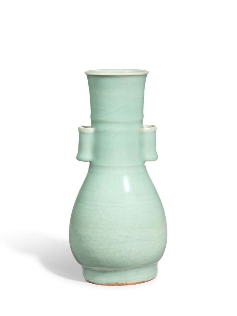 另一件千萬成交為南宋《龍泉青釉弦紋貫耳壺》,估價為150萬港元至200萬港元,經多方競爭,破千萬門檻,以1860萬港元成交,逾高估價九倍之多。本拍品原為早川千吉郎舊藏,貫耳弦紋壺器形源於高古青銅器,反映了宋人慕古之風,釉色細膩如玉,呈現出靜謐文雅的審美氛圍。