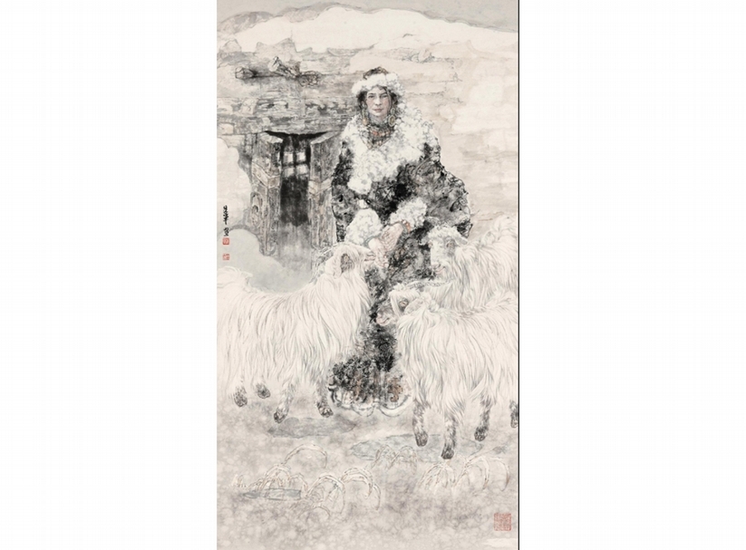Lot 6347 朱軍《牧羊女》 鏡心 設色紙本 177 × 95 cm
