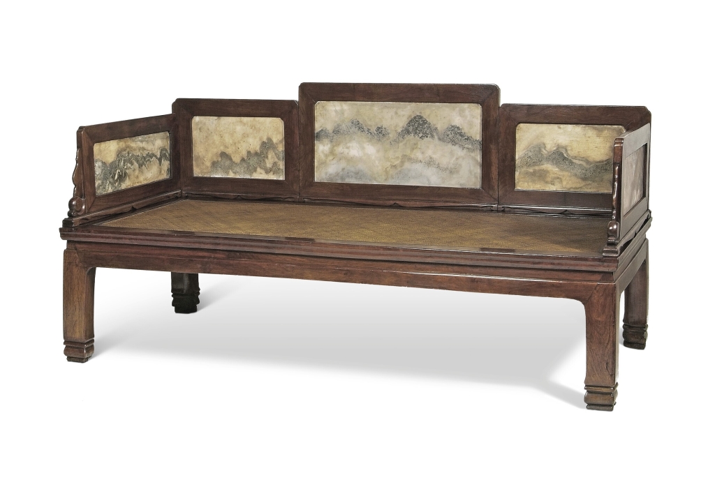 其次為晚明〈黃花梨獨板面霸王棖翹頭桌〉,獨板桌面選料厚實,素直牙子緊貼獨板,矮馬蹄足有力,估價250萬至450萬港元,1150萬港元落槌,成交價1429萬港元。其三則是晚明〈黃花梨五屏風攢邊嵌理石圍子羅漢床〉,床圍子鑲嵌大理石心板,呈現優美天然紋理,估價300萬至600萬港元,成交價1000萬5000港元。